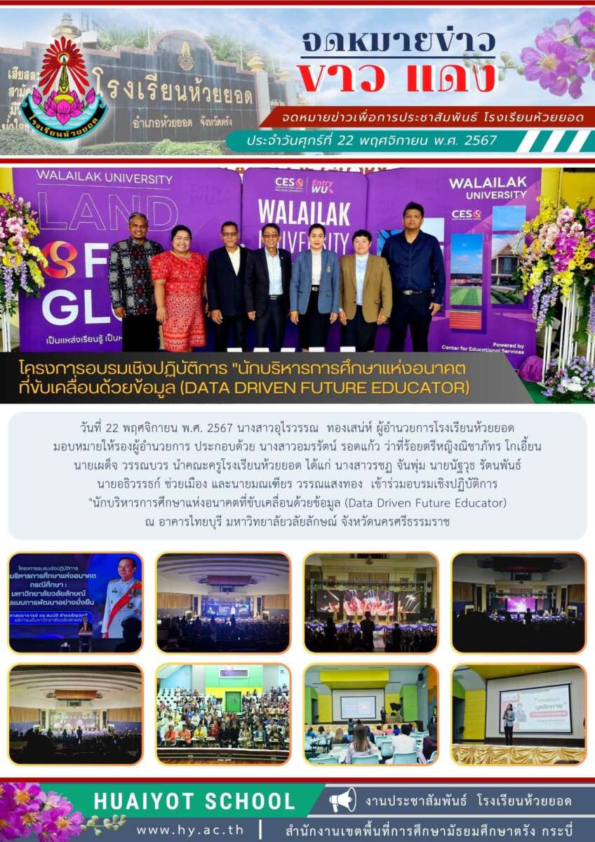วันที่ 22 พฤศจิกายน พ.ศ. 2567 นางสาวอุไรวรรณ ทองเสน่ห์ ผู้อำนวยการโรงเรียนห้วยยอด มอบหมายให้รองผู้อำนวยการ ประกอบด้วย นางสาวอมรรัตน์ รอดแก้ว ว่าที่ร้อยตรีหญิงณิชาภัทร โกเอี้ยน นายเผด็จ วรรณบวร นำคณะครูโรงเรียนห้วยยอด ได้แก่ นางสาวรชฏ จันพุ่ม นายนัฐวุธ รัตนพันธ์ นายอธิวรรธก์ ช่วยเมือง และนายมณเฑียร วรรณแสงทอง เข้าร่วมอบรมเชิงปฏิบัติการ “นักบริหารการศึกษาแห่งอนาคตที่ขับเคลื่อนด้วยข้อมูล (Data Driven Future Educator) ณ อาคารไทยบุรี มหาวิทยาลัยวลัยลักษณ์ จังหวัดนครศรีธรรมราช