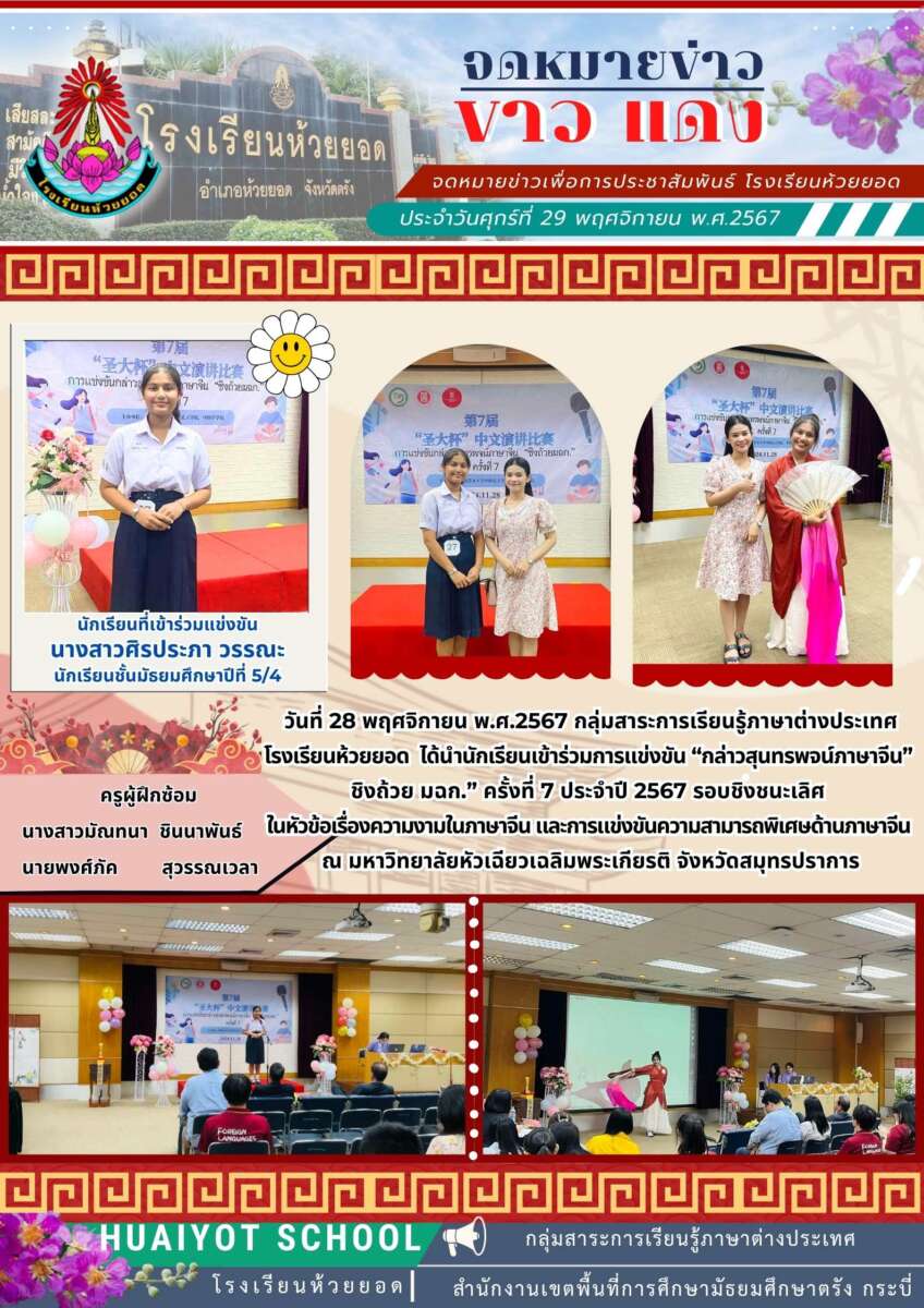 วันที่ 28 พฤศจิกายน พ.ศ.2567 กลุ่มสาระการเรียนรู้ภาษาต่างประเทศ โรงเรียนห้วยยอด ได้นำนักเรียนเข้าร่วมแข่งขัน นางสาวศิรประภา วรรณะ นักเรียนชั้นมัธยมศึกษาปีที่ 5/4 ครูผู้ฝึกซ้อม นางสาวมัณทนา ชินนาพันธ์ และ นายพงศ์ภัค สุวรรณเวลา เข้าร่วมการแข่งขัน “กล่าวสุนทรพจน์ภาษาจีน” ชิงถ้วย มฉก.” ครั้งที่ 7 ประจำปี 2567 รอบชิงชนะเลิศ ในหัวข้อเรื่องความงามในภาษาจีน และการแข่งขันความสามารถพิเศษด้านภาษาจีน ณ มหาวิทยาลัยหัวเฉียวเฉลิมพระเกียรติ จังหวัดสมุทรปราการ