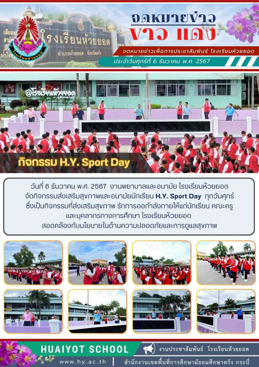 วันที่ 6 ธันวาคม พ.ศ. 2567 งานพยาบาลและอนามัย โรงเรียนห้วยยอด จัดกิจกรรมส่งเสริมสุขภาพและอนามัยนักเรียน H.Y. Sport Day ทุกวันศุกร์ ซึ่งเป็นกิจกรรมที่ส่งเสริมสุขภาพ รักการออกำลังกายให้แก่นักเรียน คณะครู และบุคลากรทางการศึกษา โรงเรียนห้วยยอด สอดคล้องกับนโยบายในด้านความปลอดภัยและการดูแลสุขภาพ