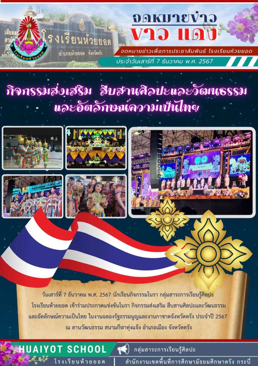 วันเสาร์ที่ 7 ธันวาคม พ.ศ. 2567 นักเรียนกิจกรรมโนรา กลุ่มสาระการเรียนรู้ศิลปะ โรงเรียนห้วยยอด เข้าร่วมประกวดแข่งขันโนรา กิจกรรมส่งเสริม สืบสานศิลปะและวัฒนธรรม และอัตลักษณ์ความเป็นไทย ในงานฉลองรัฐธรรมนูญและงานกาชาดจังหวัดตรัง ประจำปี 2567 ณ ลานวัฒนธรรม สนามกีฬาทุ่งแจ้ง อำเภอเมือง จังหวัดตรัง