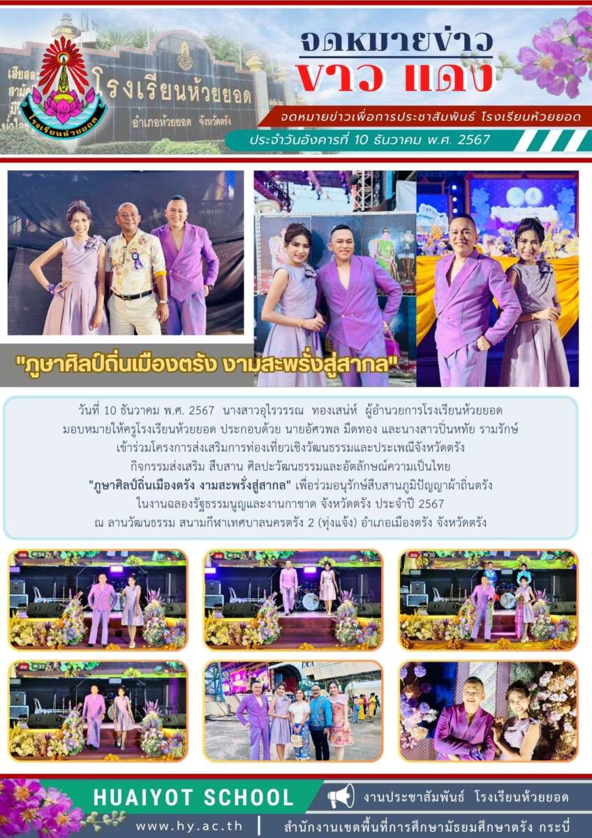 วันที่ 10 ธันวาคม พ.ศ. 2567 นางสาวอุไรวรรณ ทองเสน่ห์ ผู้อำนวยการโรงเรียนห้วยยอด มอบหมายให้ครูโรงเรียนห้วยยอด ประกอบด้วย นายอัศวพล มืดทอง และนางสาวปิ่นหทัย รามรักษ์ เข้าร่วมโครงการส่งเสริมการท่องเที่ยวเชิงวัฒนธรรมและประเพณีจังหวัดตรัง กิจกรรมส่งเสริม สืบสาน ศิลปะวัฒนธรรมและอัตลักษณ์ความเป็นไทย “ภูษาศิลป์ถิ่นเมืองตรัง งามสะพรั่งสู่สากล” เพื่อร่วมอนุรักษ์สืบสานภูมิปัญญาผ้าถิ่นตรัง ในงานฉลองรัฐธรรมนูญและงานกาชาด จังหวัดตรัง ประจำปี 2567 ณ ลานวัฒนธรรม สนามกีฬาเทศบาลนครตรัง 2 (ทุ่งแจ้ง) อำเภอเมืองตรัง จังหวัดตรัง