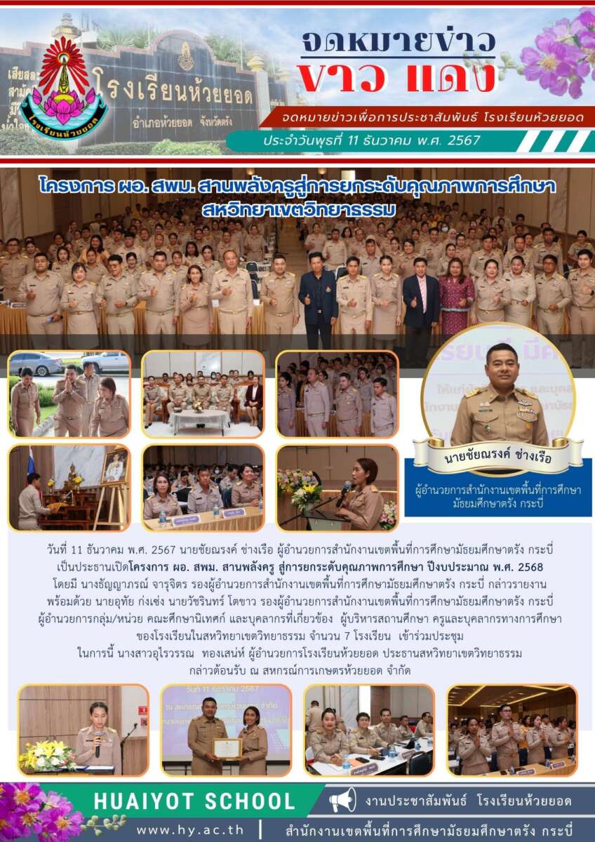 วันที่ 11 ธันวาคม พ.ศ. 2567 นายชัยณรงค์ ช่างเรือ ผู้อำนวยการสำนักงานเขตพื้นที่การศึกษามัธยมศึกษาตรัง กระบี่ เป็นประธานเปิดโครงการ ผอ. สพม. สานพลังครู สู่การยกระดับคุณภาพการศึกษา ปีงบประมาณ พ.ศ. 2568 โดยมี นางธัญญาภรณ์ จารุจิตร รองผู้อำนวยการสำนักงานเขตพื้นที่การศึกษามัธยมศึกษาตรัง กระบี่ กล่าวรายงาน พร้อมด้วย นายอุทัย ก่งเซ่ง นายวัชรินทร์ โตขาว รองผู้อำนวยการสำนักงานเขตพื้นที่การศึกษามัธยมศึกษาตรัง กระบี่ ผู้อำนวยการกลุ่ม/หน่วย คณะศึกษานิเทศก์ และบุคลากรที่เกี่ยวข้อง ผู้บริหารสถานศึกษา ครูและบุคลากรทางการศึกษา ของโรงเรียนในสหวิทยาเขตวิทยาธรรม จำนวน 7 โรงเรียน เข้าร่วมประชุม ในการนี้ นางสาวอุไรวรรณ ทองเสน่ห์ ผู้อำนวยการโรงเรียนห้วยยอด ประธานสหวิทยาเขตวิทยาธรรมกล่าวต้อนรับ ณ สหกรณ์การเกษตรห้วยยอด จำกัด