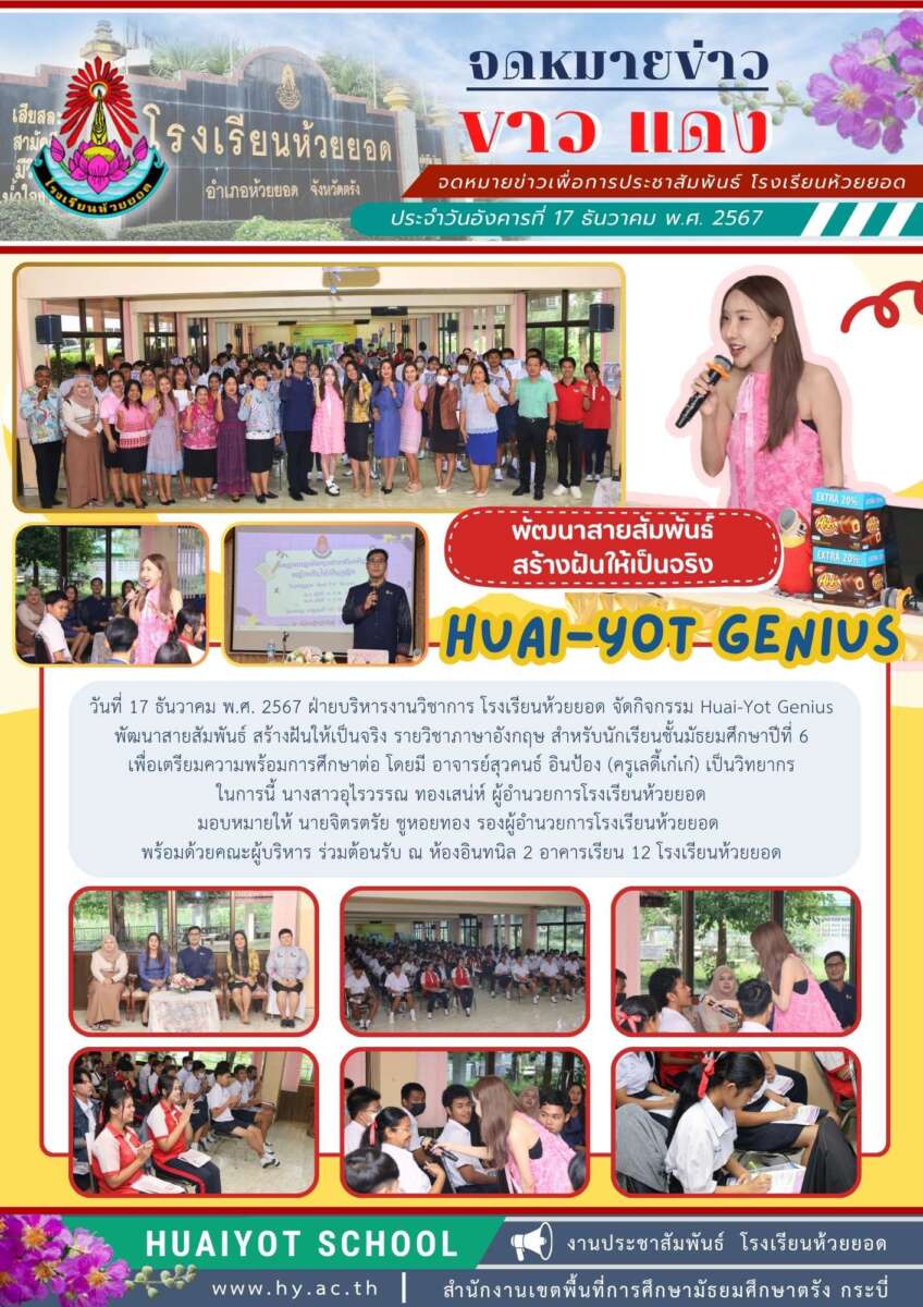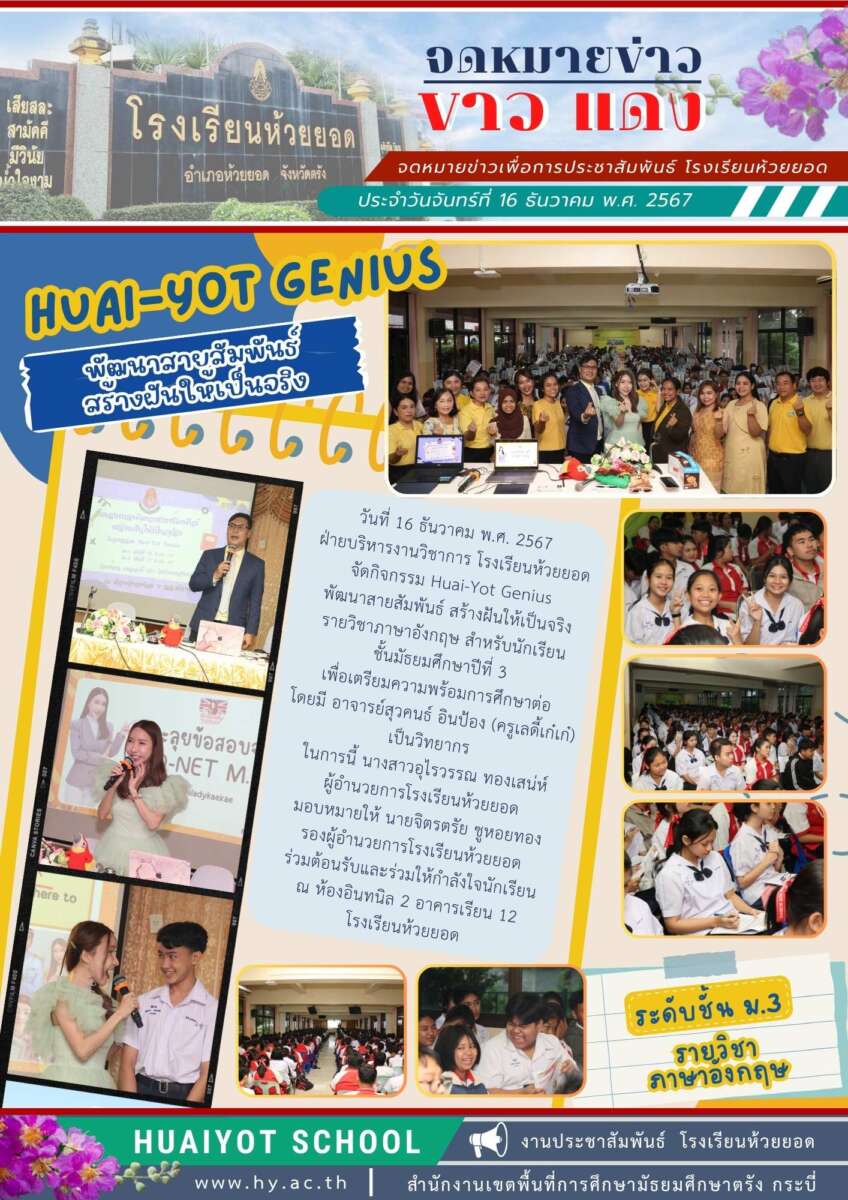 วันที่ 16-17 ธันวาคม พ.ศ. 2567 ฝ่ายบริหารงานวิชาการ โรงเรียนห้วยยอด จัดกิจกรรม Huai-Yot Genius พัฒนาสายสัมพันธ์ สร้างฝันให้เป็นจริง รายวิชาภาษาอังกฤษ สำหรับนักเรียน ชั้นมัธยมศึกษาปีที่ 3 และ 6 เพื่อเตรียมความพร้อมการศึกษาต่อ โดยมี อาจารย์สุวคนธ์ อินป้อง (ครูเลดี้เก๋เก๋) เป็นวิทยากร ในการนี้ นางสาวอุไรวรรณ ทองเสน่ห์ ผู้อำนวยการโรงเรียนห้วยยอด มอบหมายให้ นายจิตรตรัย ชูหอยทอง รองผู้อำนวยการโรงเรียนห้วยยอด ร่วมต้อนรับและร่วมให้กำลังใจนักเรียน ณ ห้องอินทนิล 2 อาคารเรียน 12 โรงเรียนห้วยยอด