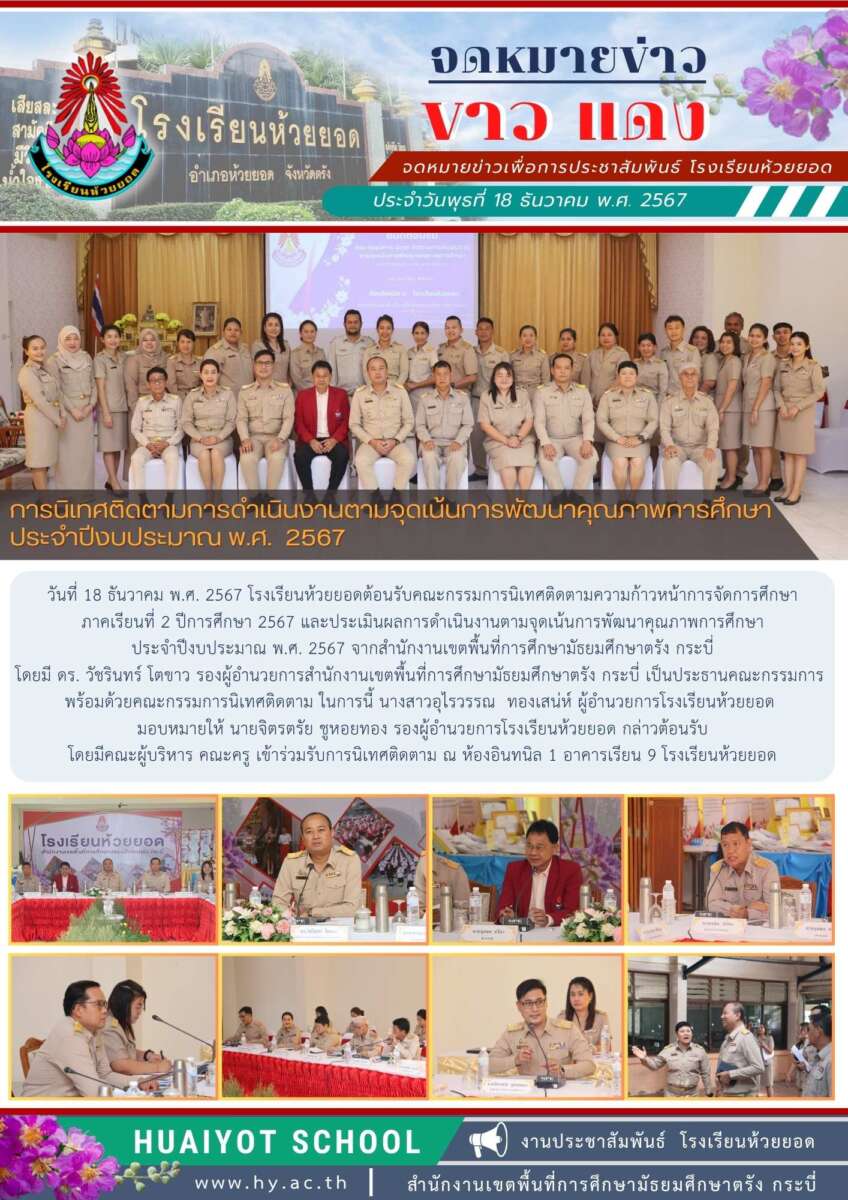 วันที่ 18 ธันวาคม พ.ศ. 2567 โรงเรียนห้วยยอดต้อนรับคณะกรรมการนิเทศติดตามความก้าวหน้าการจัดการศึกษา ภาคเรียนที่ 2 ปีการศึกษา 2567 และประเมินผลการดำเนินงานตามจุดเน้นการพัฒนาคุณภาพการศึกษา ประจำปีงบประมาณ พ.ศ. 2567 จากสำนักงานเขตพื้นที่การศึกษามัธยมศึกษาตรัง กระบี่ โดยมี ดร. วัชรินทร์ โตขาว รองผู้อำนวยการสำนักงานเขตพื้นที่การศึกษามัธยมศึกษาตรัง กระบี่ เป็นประธานคณะกรรมการ พร้อมด้วยคณะกรรมการนิเทศติดตาม ในการนี้ นางสาวอุไรวรรณ ทองเสน่ห์ ผู้อำนวยการโรงเรียนห้วยยอด มอบหมายให้ นายจิตรตรัย ชูหอยทอง รองผู้อำนวยการโรงเรียนห้วยยอด กล่าวต้อนรับ โดยมีคณะผู้บริหาร คณะครู เข้าร่วมรับการนิเทศติดตาม ณ ห้องอินทนิล 1 อาคารเรียน 9 โรงเรียนห้วยยอด