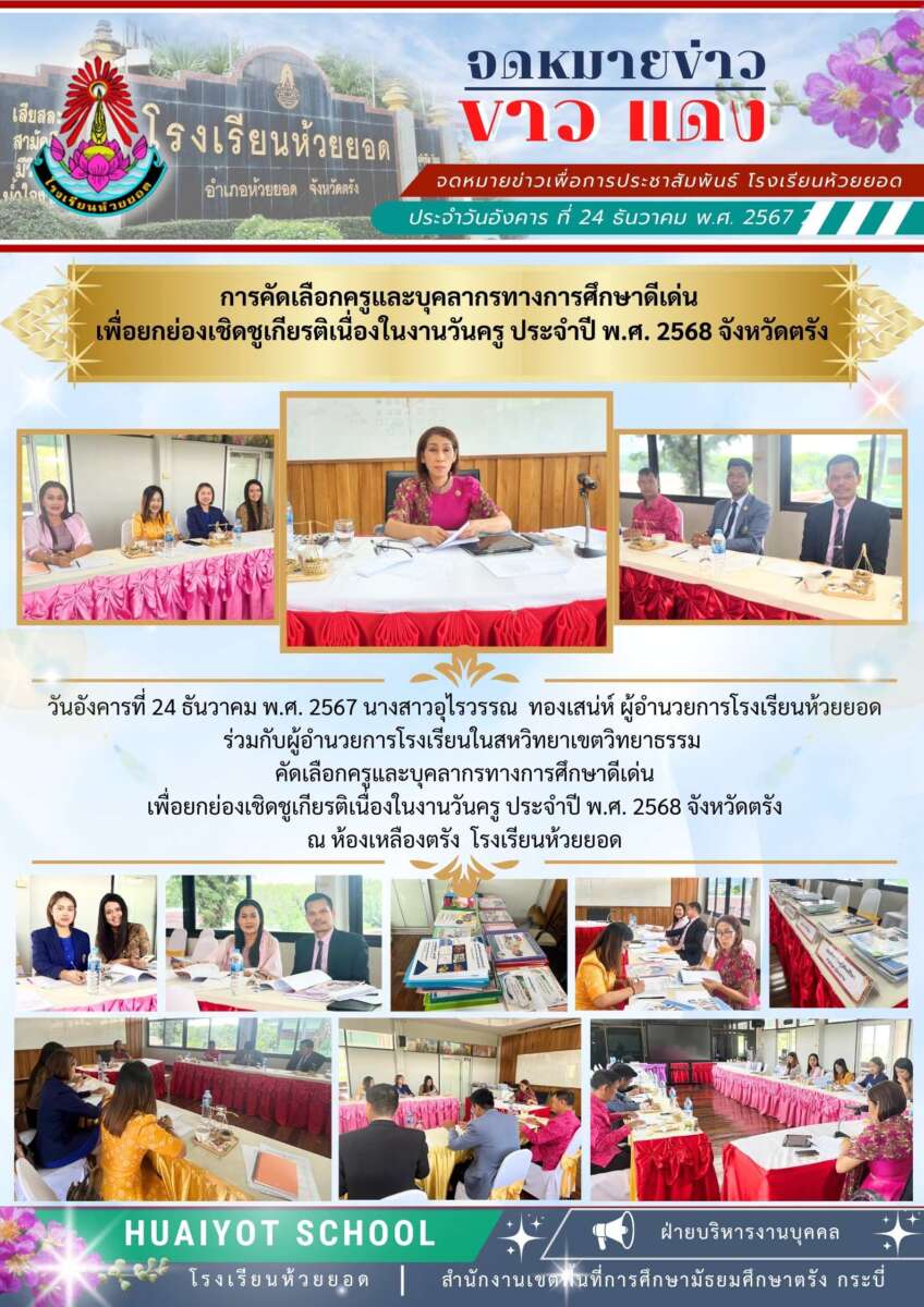 วันอังคารที่ 24 ธันวาคม พ.ศ. 2567 นางสาวอุไรวรรณ ทองเสน่ห์ ผู้อำนวยการโรงเรียนห้วยยอด ร่วมกับผู้อำนวยการโรงเรียนในสหวิทยาเขตวิทยาธรรม คัดเลือกครูและบุคลากรทางการศึกษาดีเด่น เพื่อยกย่องเชิดชูเกียรติเนื่องในงานวันครู ประจำปี พ.ศ. 2568 จังหวัดตรัง ณ ห้องเหลืองตรัง โรงเรียนห้วยยอด