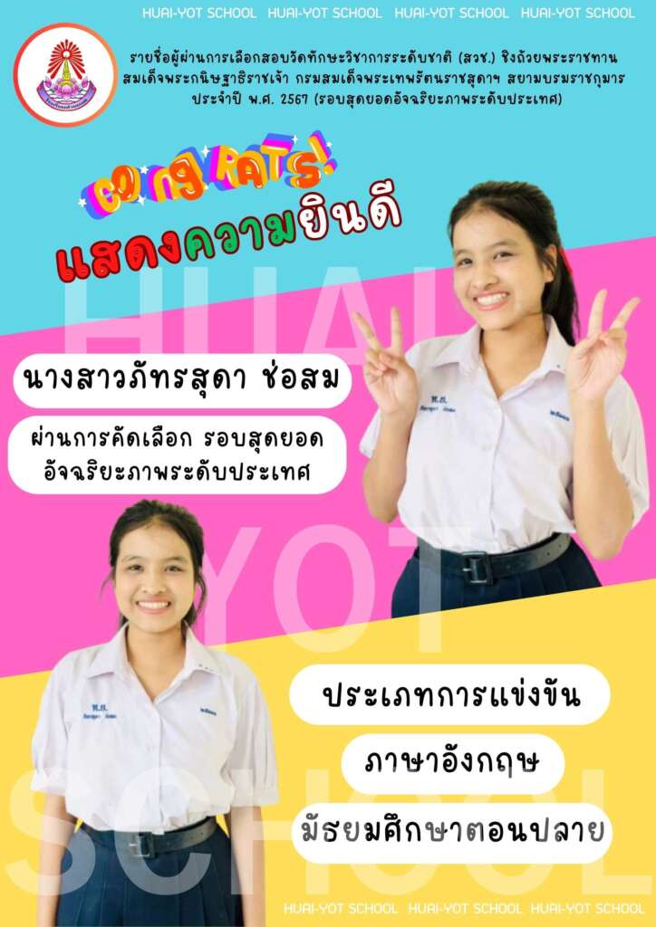โรงเรียนห้วยยอดขอแสดงความยินดีกับนักเรียนผู้ผ่านการเลือกสอบวัดทักษะวิชาการระดับชาติ (สวช.) ชิงถ้วยพระราชทาน สมเด็จพระกนิษฐาธิราชเจ้า กรมสมเด็จพระเทพรัตนราชสุดาฯ สยามบรมราชกุมาร ประจำปี พ.ศ. 2567 (รอบสุดยอดอัจฉริยะภาพระดับประเทศ)