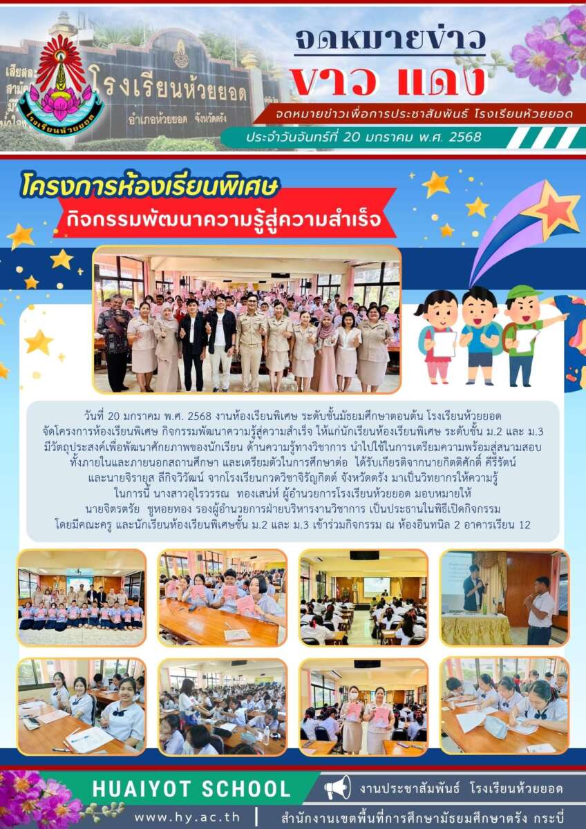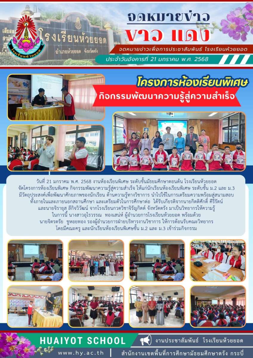 วันที่ 20-21 มกราคม พ.ศ. 2568 งานห้องเรียนพิเศษ ระดับชั้นมัธยมศึกษาตอนต้น โรงเรียนห้วยยอด จัดโครงการห้องเรียนพิเศษ กิจกรรมพัฒนาความรู้สู่ความสำเร็จ ให้แก่นักเรียนห้องเรียนพิเศษ ระดับชั้น ม.2 และ ม.3 มีวัตถุประสงค์เพื่อพัฒนาศักยภาพของนักเรียน ด้านความรู้ทางวิชาการ นำไปใช้ในการเตรียมความพร้อมสู่สนามสอบ ทั้งภายในและภายนอกสถานศึกษา และเตรียมตัวในการศึกษาต่อ ได้รับเกียรติจากนายกิตติศักดิ์ คีรีรัตน์ และนายจิรายุส ลีกิจวิวัฒน์ จากโรงเรียนกวดวิชาจิรัญกิตต์ จังหวัดตรัง มาเป็นวิทยากรให้ความรู้ ในการนี้ นางสาวอุไรวรรณ ทองเสน่ห์ ผู้อำนวยการโรงเรียนห้วยยอด พร้อมด้วย นายจิตรตรัย ชูหอยทอง รองผู้อำนวยการฝ่ายบริหารงานวิชาการ ให้การต้อนรับคณะวิทยากร โดยมีคณะครู และนักเรียนห้องเรียนพิเศษชั้น ม.2 และ ม.3 เข้าร่วมกิจกรรม