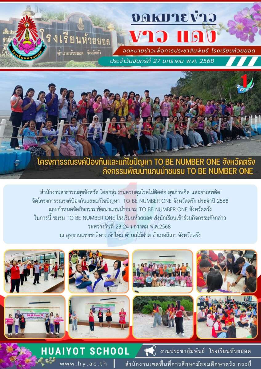 สำนักงานสาธารณสุขจังหวัด โดยกลุ่มงานควบคุมโรคไม่ติดต่อ สุขภาพจิต และยาเสพติด จัดโครงการรณรงค์ป้องกันและแก้ไขปัญหา TO BE NUMBER ONE จังหวัดตรัง ประจำปี 2568 และกำหนดจัดกิจกรรมพัฒนาแกนนำชมรม TO BE NUMBER ONE จังหวัดตรัง ในการนี้ ชมรม TO BE NUMBER ONE โรงเรียนห้วยยอด ส่งนักเรียนเข้าร่วมกิจกรรมดังกล่าว ระหว่างวันที่ 23-24 มกราคม พ.ศ.2568 ณ อุทยานแห่งชาติหาดเจ้าไหม ตำบลไม้ฝาด อำเภอสิเกา จังหวัดตรัง