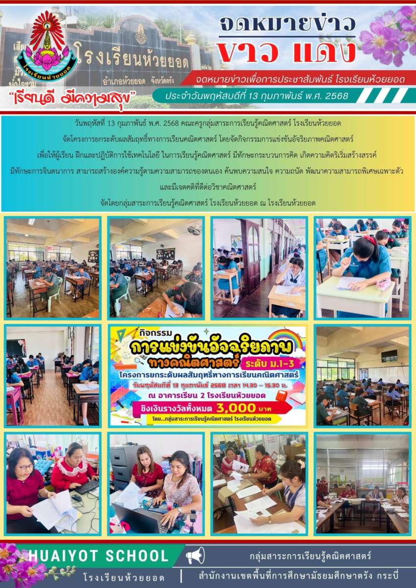 วันพฤหัสที่ 13 กุมภาพันธ์ พ.ศ. 2568 คณะครูกลุ่มสาระการเรียนรู้คณิตศาสตร์ โรงเรียนห้วยยอดจัดโครงการยกระดับผลสัมฤทธิ์ทางการเรียนคณิตศาสตร์ โดยจัดกิจกรรมการแข่งขันอัจริยภาพคณิตศาสตร์เพื่อให้ผู้เรียน ฝึกและปฎิบัติการใช้เทคโนโลยี ในการเรียนรู้คณิตศาสตร์ มีทักษะกระบวนการคิด เกิดความคิดริเริ่มสร้างสรรค์ มีทักษะการจินตนาการ สามารถสร้างองค์ความรู้ตามความสามารถของตนเอง ค้นพบความสนใจ ความถนัด พัฒนาความสามารถพิเศษเฉพาะตัว และมีเจตคติที่ดีต่อวิชาคณิตศาสตร์ จัดโดยกลุ่มสาระการเรียนรู้คณิตศาสตร์ โรงเรียนห้วยยอด ณ โรงเรียนห้วยยอด