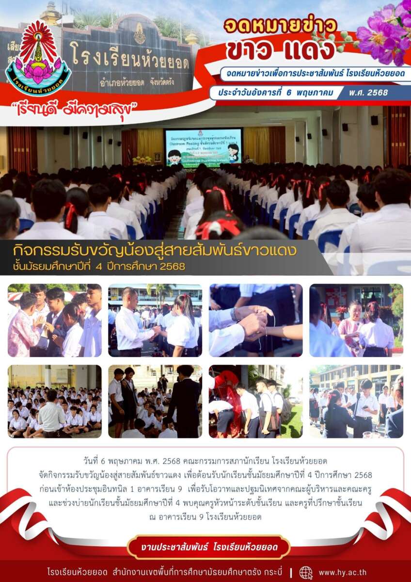 วันที่ 6 พฤษภาคม พ.ศ. 2568 โรงเรียนห้วยยอด จัดกิจกรรมปฐมนิเทศนักเรียนชั้นมัธยมศึกษาปีที่ 4 ประจำปีการศึกษา 2568 โดยมีกิจกรรมรับขวัญน้องสู่สายสัมพันธ์ขาวแดง จากคณะกรรมการสภานักเรียนก่อนเข้าห้องประชุม และการประชุมผู้ปกครองนักเรียน ชั้นมัธยมศึกษาปีที่ 4 ประจำปีการศึกษา 2568 พร้อมด้วยคณะผู้บริหารของโรงเรียนห้วยยอด นายโชคดี คีรีกิ้น ประธานผู้ปกครองนักเรียนเครือข่าย พบปะผู้ปกครองนักเรียน ในการนี้ นางสาวอุไรวรรณ ทองเสน่ห์ ผู้อำนวยการโรงเรียนห้วยยอด เป็นประธานในพิธีเปิดกิจกรรมพร้อมด้วยคณะผู้บริหารโรงเรียนห้วยยอด ให้โอวาทและกล่าวปฐมนิเทศนักเรียน ณ ห้องประชุมอินทนิล 1 อาคารเรียน 9 โรงเรียนห้วยยอด