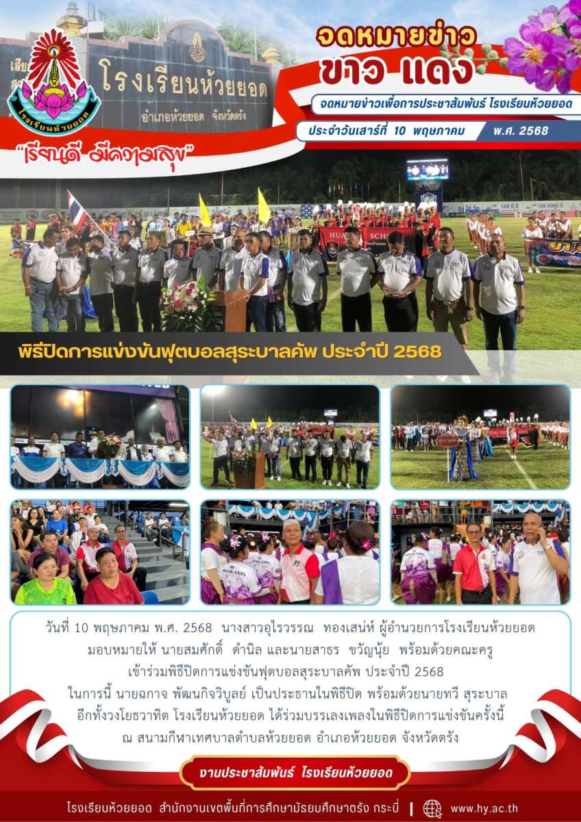โรงเรียนห้วยยอดเข้าร่วมพิธีปิดการแข่งขันฟุตบอลสุระบาลคัพ ประจำปี 2568