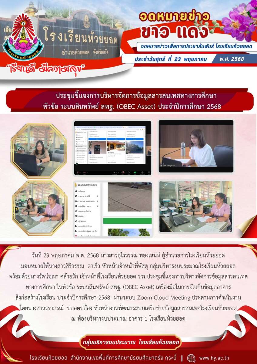 วันที่ 23 พฤษภาคม พ.ศ. 2568 นางสาวอุไรวรรณ ทองเสน่ห์ ผู้อำนวยการโรงเรียนห้วยยอด มอบหมายให้นางสาวสิริวรรณ ตาเร็ว หัวหน้าเจ้าหน้าที่พัสดุ กลุ่มบริหารงบประมาณโรงเรียนห้วยยอด พร้อมด้วยนางรัตน์ชณา คล้ายรัก เจ้าหน้าที่โรงเรียนห้วยยอด ร่วมประชุมชี้เเจงการบริหารจัดการข้อมูลสารสนเทศทางการศึกษา ในหัวข้อ ระบบสินทรัพย์ สพฐ. (OBEC Asset) เครื่องมือในการจัดเก็บข้อมูลอาคาร สิ่งก่อสร้างโรงเรียน ประจำปีการศึกษา 2568 ผ่านระบบ Zoom Cloud Meeting ประสานการดำเนินงาน โดยนางสาววราภรณ์ ปลอดปล้อง หัวหน้างานพัฒนาระบบเครือข่ายข้อมูลสารสนเทศโรงเรียนห้วยยอด ณ ห้องบริหารงบประมาณ อาคาร 1 โรงเรียนห้วยยอด