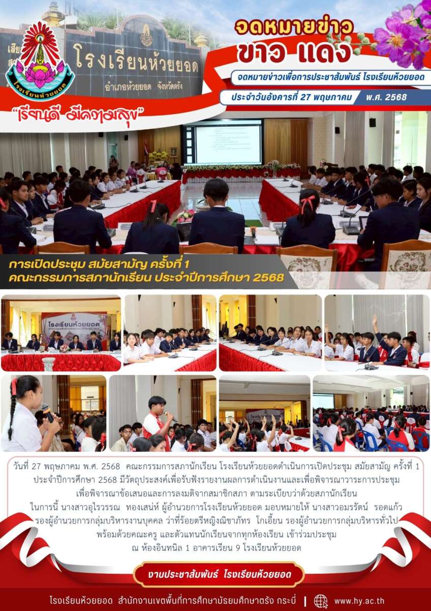 วันที่ 27 พฤษภาคม พ.ศ. 2568 คณะกรรมการสภานักเรียน โรงเรียนห้วยยอดดำเนินการเปิดประชุม สมัยสามัญ ครั้งที่ 1 ประจำปีการศึกษา 2568 มีวัตถุประสงค์เพื่อรับฟังรายงานผลการดำเนินงานและเพื่อพิจารณาวาระการประชุม เพื่อพิจารณาข้อเสนอและการลงมติจากสมาชิกสภา ตามระเบียบว่าด้วยสภานักเรียน ในการนี้ นางสาวอุไรวรรณ ทองเสน่ห์ ผู้อำนวยการโรงเรียนห้วยยอด มอบหมายให้ นางสาวอมรรัตน์ รอดแก้ว รองผู้อำนวยการกลุ่มบริหารงานบุคคล ว่าที่ร้อยตรีหญิงณิชาภัทร โกเอี้ยน รองผู้อำนวยการกลุ่มบริหารทั่วไป พร้อมด้วยคณะครู และตัวแทนนักเรียนจากทุกห้องเรียน เข้าร่วมประชุม ณ ห้องอินทนิล 1 อาคารเรียน 9 โรงเรียนห้วยยอด