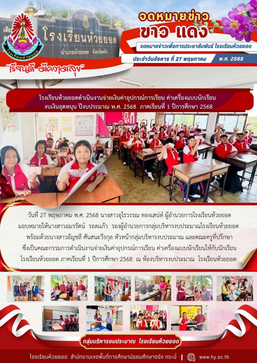 วันที่ 27 พฤษภาคม พ.ศ. 2568 นางสาวอุไรวรรณ ทองเสน่ห์ ผู้อำนวยการโรงเรียนห้วยยอด มอบหมายให้นางสาวอมรรัตน์ รอดเเก้ว รองผู้อำนวยการกลุ่มบริหารงบประมาณโรงเรียนห้วยยอด พร้อมด้วยนางสาวอัญชลี ศันสนะวีรกุล หัวหน้ากลุ่มบริหารงบประมาณ และคณะครูที่ปรึกษา ซึ่งเป็นคณะกรรมการดำเนินงานจ่ายเงินค่าอุปกรณ์การเรียน ค่าเครื่องแบบนักเรียนให้กับนักเรียน โรงเรียนห้วยยอด ภาคเรียนที่ 1 ปีการศึกษา 2568 ณ ห้องบริหารงบประมาณ โรงเรียนห้วยยอด