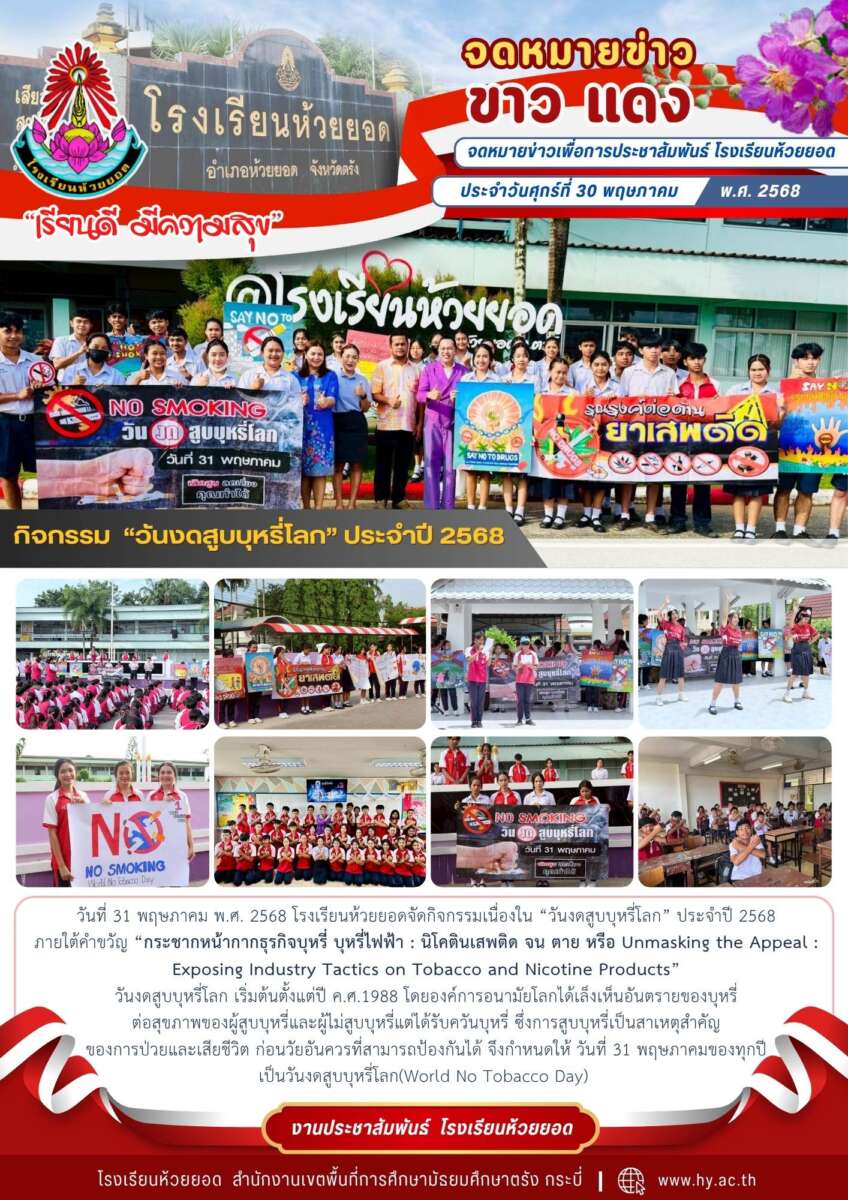 วันที่ 31 พฤษภาคม พ.ศ. 2568 โรงเรียนห้วยยอดจัดกิจกรรมเนื่องใน “วันงดสูบบุหรี่โลก” ประจำปี 2568 ภายใต้คำขวัญ “กระชากหน้ากากธุรกิจบุหรี่ บุหรี่ไฟฟ้า : นิโคตินเสพติด จน ตาย หรือ Unmasking the Appeal : Exposing Industry Tactics on Tobacco and Nicotine Products” วันงดสูบบุหรี่โลก เริ่มต้นตั้งแต่ปี ค.ศ.1988 โดยองค์การอนามัยโลกได้เล็งเห็นอันตรายของบุหรี่ ต่อสุขภาพของผู้สูบบุหรี่และผู้ไม่สูบบุหรี่แต่ได้รับควันบุหรี่ ซึ่งการสูบบุหรี่เป็นสาเหตุสำคัญ ของการป่วยและเสียชีวิต ก่อนวัยอันควรที่สามารถป้องกันได้ จึงกำหนดให้ วันที่ 31 พฤษภาคมของทุกปีเป็นวันงดสูบบุหรี่โลก(World No Tobacco Day)