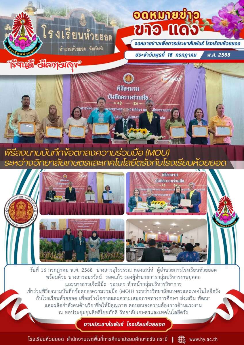 วันที่ 16 กรกฎาคม พ.ศ. 2568 นางสาวอุไรวรรณ ทองเสน่ห์ ผู้อำนวยการโรงเรียนห้วยยอด พร้อมด้วย นางสาวอมรรัตน์ รอดแก้ว รองผู้อำนวยการกลุ่มบริหารงานบุคคล และนางสาวเจ๊ะมีน๊ะ รองเดช หัวหน้ากลุ่มบริหารวิชาการ เข้าร่วมพิธีลงนามบันทึกข้อตกลงความร่วมมือ (MOU) ระหว่างวิทยาลัยเกษตรและเทคโนโลยีตรัง กับโรงเรียนห้วยยอด เพื่อสร้างโอกาสและความเสมอภาคทางการศึกษา ส่งเสริม พัฒนาและผลิตกำลังคนด้านวิชาชีพให้มีคุณภาพ ตอบสนองความต้องการด้านแรงงาน ณ หอประชุมขุนสิทธิไชยภักดี วิทยาลัยเกษตรและเทคโนโลยีตรัง