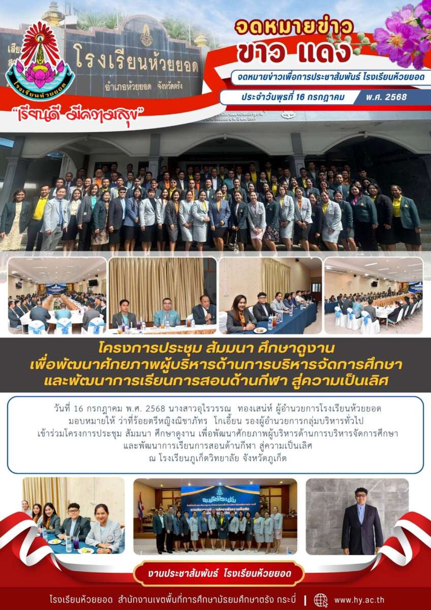 วันที่ 16 กรกฎาคม พ.ศ. 2568 นางสาวอุไรวรรณ ทองเสน่ห์ ผู้อำนวยการโรงเรียนห้วยยอด มอบหมายให้ ว่าที่ร้อยตรีหญิงณิชาภัทร โกเอี้ยน รองผู้อำนวยการกลุ่มบริหารทั่วไป เข้าร่วมโครงการประชุม สัมมนา ศึกษาดูงาน เพื่อพัฒนาศักยภาพผู้บริหารด้านการบริหารจัดการศึกษา และพัฒนาการเรียนการสอนด้านกีฬา สู่ความเป็นเลิศ ณ โรงเรียนภูเก็ตวิทยาลัย จังหวัดภูเก็ต
