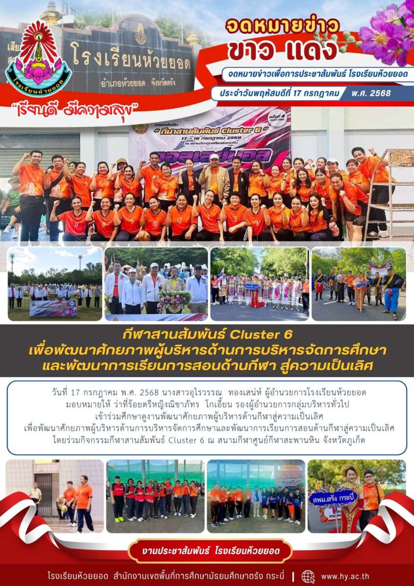 วันที่ 17 กรกฎาคม พ.ศ. 2568 นางสาวอุไรวรรณ ทองเสน่ห์ ผู้อำนวยการโรงเรียนห้วยยอดมอบหมายให้ ว่าที่ร้อยตรีหญิงณิชาภัทร โกเอี้ยน รองผู้อำนวยการกลุ่มบริหารทั่วไปเข้าร่วมศึกษาดูงานพัฒนาศักยภาพผู้บริหารด้านกีฬาสู่ความเป็นเลิศเพื่อพัฒนาศักยภาพผู้บริหารด้านการบริหารจัดการศึกษาและพัฒนาการเรียนการสอนด้านกีฬาสู่ความเป็นเลิศโดยร่วมกิจกรรมกีฬาสานสัมพันธ์ Cluster 6 ณ สนามกีฬาศูนย์กีฬาสะพานหิน จังหวัดภูเก็ต
