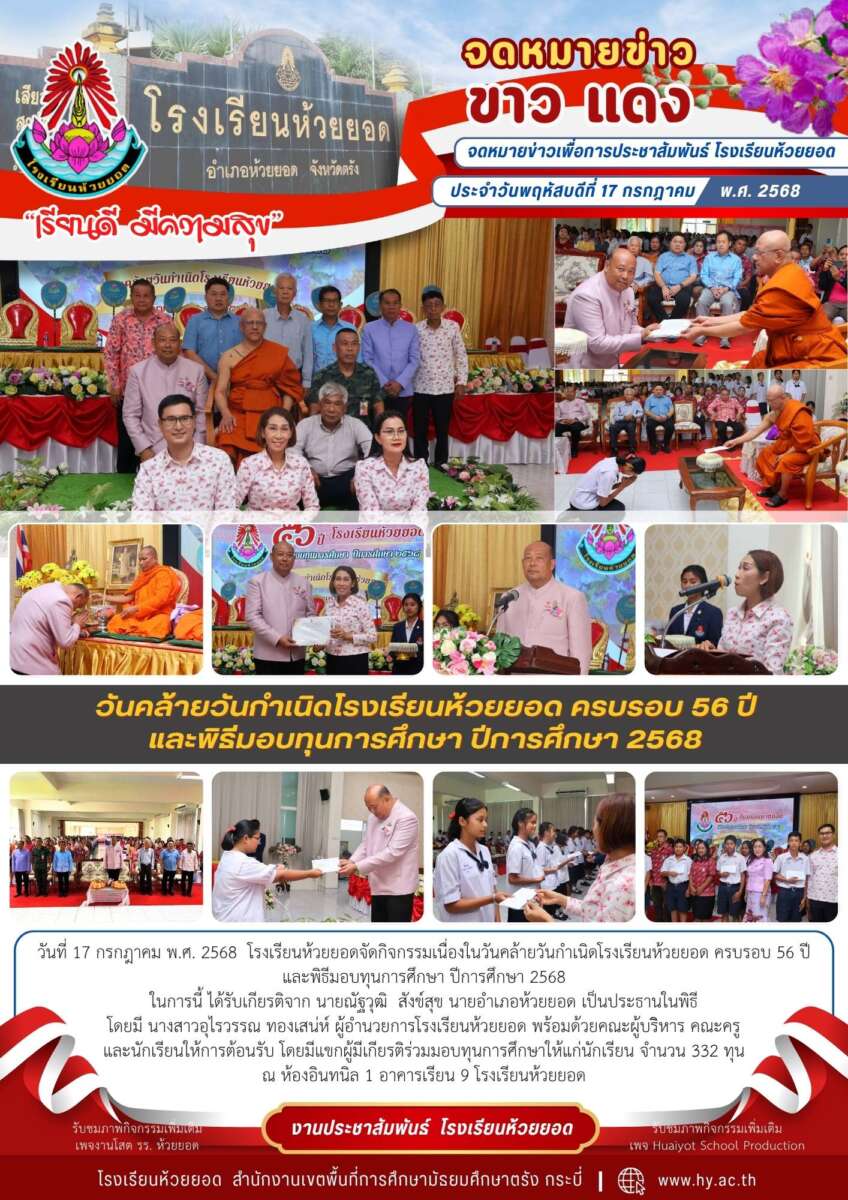วันที่ 17 กรกฎาคม พ.ศ. 2568 โรงเรียนห้วยยอดจัดกิจกรรมเนื่องในวันคล้ายวันกำเนิดโรงเรียนห้วยยอด ครบรอบ 56 ปี และพิธีมอบทุนการศึกษา ปีการศึกษา 2568 ในการนี้ ได้รับเกียรติจาก นายณัฐวุฒิ สังข์สุข นายอำเภอห้วยยอด เป็นประธานในพิธีโดยมี นางสาวอุไรวรรณ ทองเสน่ห์ ผู้อำนวยการโรงเรียนห้วยยอด พร้อมด้วยคณะผู้บริิหาร คณะครู และนักเรียนให้การต้อนรับ โดยมีแขกผู้มีเกียรติร่วมมอบทุนการศึกษาให้แก่นักเรียน จำนวน 332 ทุน ณ ห้องอินทนิล 1 อาคารเรียน 9 โรงเรียนห้วยยอด
