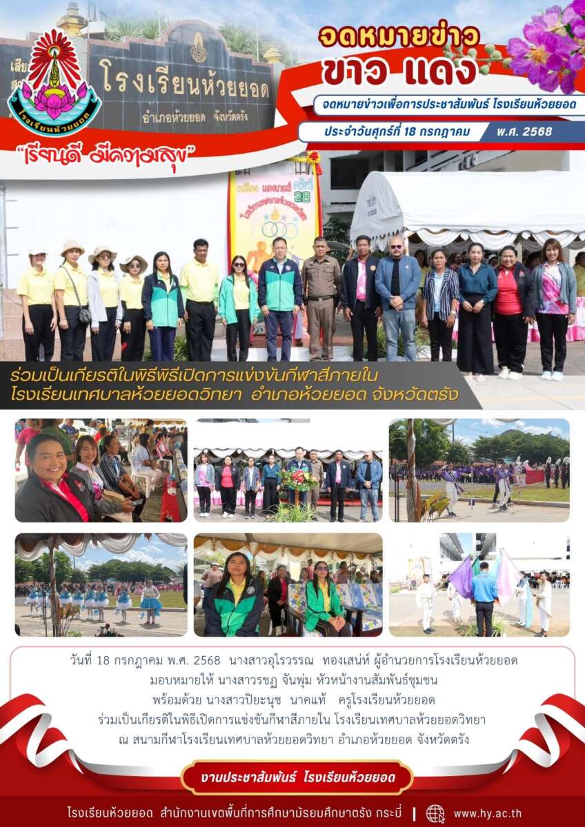 วันที่ 18 กรกฎาคม พ.ศ. 2568 นางสาวอุไรวรรณ ทองเสน่ห์ ผู้อำนวยการโรงเรียนห้วยยอด มอบหมายให้ นางสาวรชฏ จันพุ่ม หัวหน้างานสัมพันธ์ชุมชน พร้อมด้วย นางสาวปิยะนุช นาคแท้ ครูโรงเรียนห้วยยอดร่วมเป็นเกียรติในพิธีเปิดการแข่งขันกีฬาสีภายใน โรงเรียนเทศบาลห้วยยอดวิทยา ณ สนามกีฬาโรงเรียนเทศบาลห้วยยอดวิทยา อำเภอห้วยยอด จังหวัดตรัง
