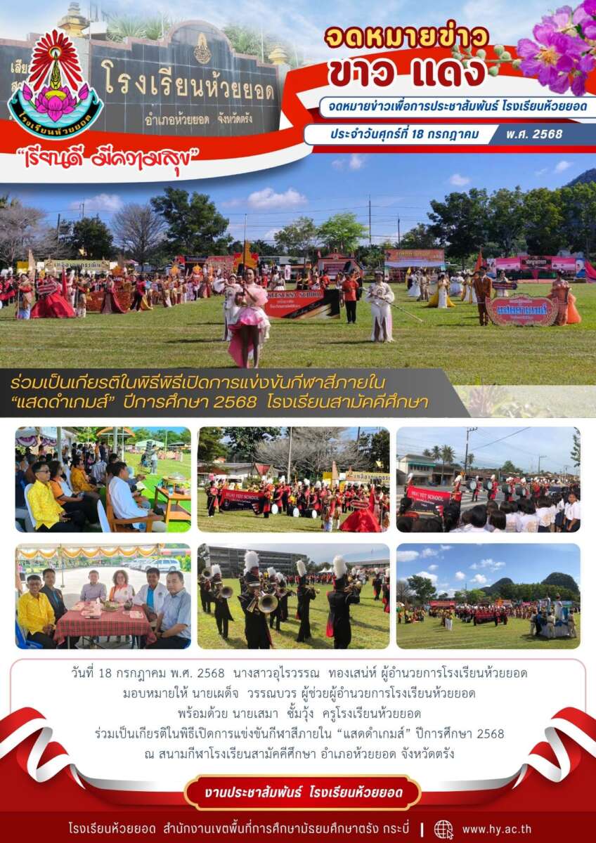 วันที่ 18 กรกฎาคม พ.ศ. 2568 นางสาวอุไรวรรณ ทองเสน่ห์ ผู้อำนวยการโรงเรียนห้วยยอด มอบหมายให้ นายเผด็จ วรรณบวร ผู้ช่วยผู้อำนวยการโรงเรียนห้วยยอด พร้อมด้วย นายเสมา ซั้มวุ้ง ครูโรงเรียนห้วยยอด ร่วมเป็นเกียรติในพิธีเปิดการแข่งขันกีฬาสีภายใน “แสดดำเกมส์” ปีการศึกษา 2568 ณ สนามกีฬาโรงเรียนสามัคคีศึกษา อำเภอห้วยยอด จังหวัดตรัง