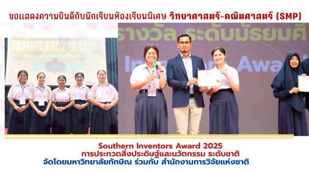 Read Moreขอเเสดงความยินดีกับนักเรียนห้องเรียนพิเศษ วิทยาศาสตร์-คณิตศาสตร์ (SMP) ได้รับรางวัล Southern Inventors Award 2025 การประกวดสิ่งประดิษฐ์และนวัตกรรม ระดับชาติ จัดโดยมหาวิทยาลัยทักษิณ ร่วมกับ สำนักงานการวิจัยแห่งชาติ