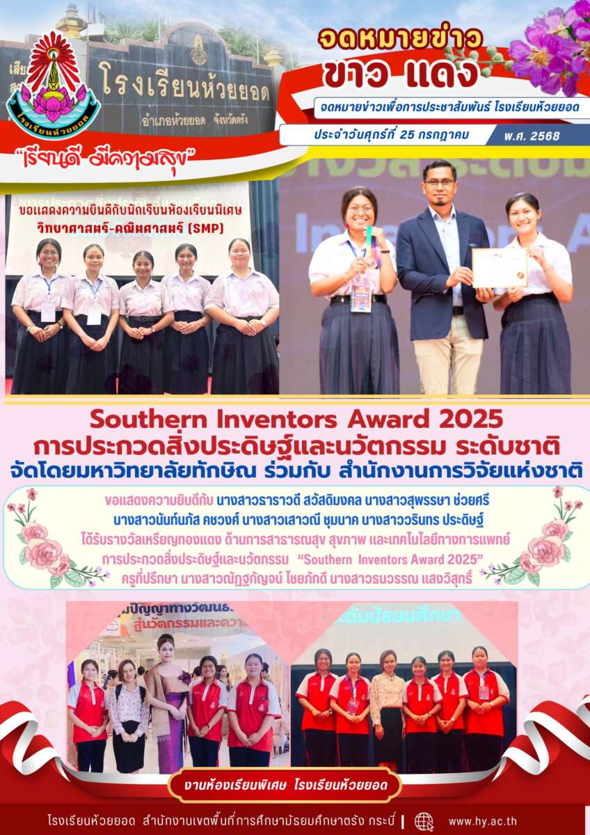 ขอแสดงความยินดีกับ นางสาวธาราวดี สวัสดิมงคล นางสาวสุพรรษา ช่วยศรีนางสาวนันท์นภัส คชวงศ์ นางสาวเสาวณี ชุมนาค นางสาววรินทร ประดิษฐ์ ได้รับรางวัลเหรียญทองแดง ด้านการสาธารณสุข สุขภาพ และเทคโนโลยีทางการแพทย์การประกวดสิ่งประดิษฐ์และนวัตกรรม “Southern Inventors Award 2025” ครูที่ปรึกษา นางสาวณัฏฐกัญจน์ ไชยภักดี นางสาวธนวรรณ แสงวิสุทธิ์