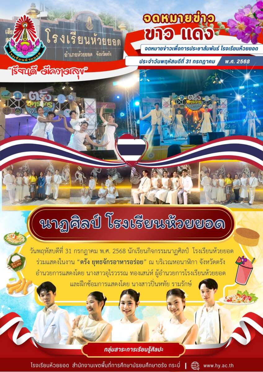 วันพฤหัสบดีที่ 31 กรกฎาคม พ.ศ. 2568 นักเรียนกิจกรรมนาฏศิลป์ โรงเรียนห้วยยอด ร่วมแสดงในงาน “ตรัง ยุทธจักรอาหารอร่อย” ณ บริเวณหอนาฬิกา จังหวัดตรัง อำนวยการแสดงโดย นางสาวอุไรวรรณ ทองเสน่ห์ ผู้อำนวยการโรงเรียนห้วยยอด และฝึกซ้อมการแสดงโดย นางสาวปิ่นหทัย รามรักษ์