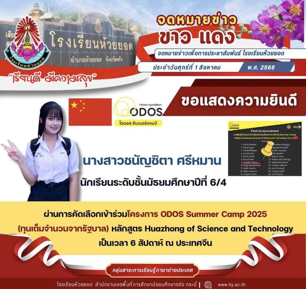 ขอแสดงความยินดี นางสาวชณัญชิตา ศรีหมาน นักเรียนชั้นมัธยมศึกษาปีที่ 6 โรงเรียนห้วยยอด ผ่านการคัดเลือกทุน ODOS Summer Camp 2025 ณ ประเทศจีน (wuhan) “ทุนเรียนซัมเมอร์ต่างประเทศแบบเต็มจำนวน 100% จากรัฐบาลไทย” (จากผู้สมัคร 4,339 คน ทั่วประเทศ คัดเลือกเหลือ 928 คน)