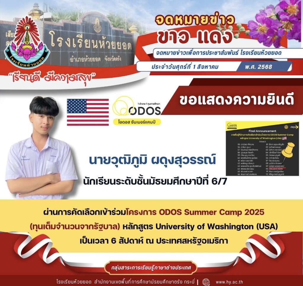 ขอแสดงความยินดี นายวุฒิภูมิ ผดุงสุวรรณ์ ผ่านการคัดเลือกทุน ODOS Summer Camp 2025 ณ ประเทศสหรัฐอเมริกา (USA) “ทุนเรียนซัมเมอร์ต่างประเทศแบบเต็มจำนวน 100% จากรัฐบาลไทย” (จากผู้สมัคร 4,339 คน ทั่วประเทศ คัดเลือกเหลือ 928 คน)