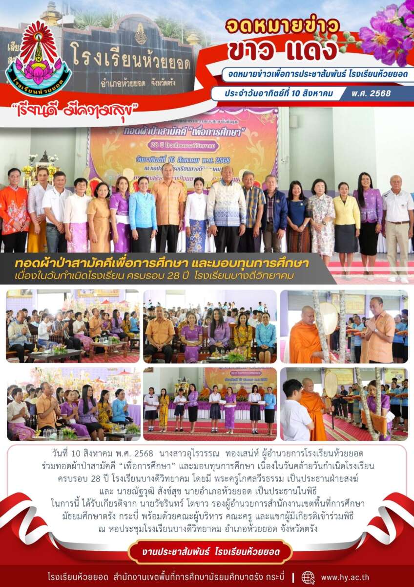 วันที่ 10 สิงหาคม พ.ศ. 2568 นางสาวอุไรวรรณ ทองเสน่ห์ ผู้อำนวยการโรงเรียนห้วยยอด ร่วมทอดผ้าป่าสามัคคี “เพื่อการศึกษา” และมอบทุนการศึกษา เนื่องในวันคล้ายวันกำเนิดโรงเรียน ครบรอบ 28 ปี โรงเรียนบางดีวิทยาคม โดยมี พระครูโกศลวีรธรรม เป็นประธานฝ่ายสงฆ์ และ นายณัฐวุฒิ สังข์สุข นายอำเภอห้วยยอด เป็นประธานในพิธี ในการนี้ ได้รับเกียรติจาก นายวัชรินทร์ โตขาว รองผู้อำนวยการสำนักงานเขตพื้นที่การศึกษามัธยมศึกษาตรัง กระบี่ พร้อมด้วยคณะผู้บริหาร คณะครู และแขกผู้มีเกียรติเข้าร่วมพิธี ณ หอประชุมโรงเรียนบางดีวิทยาคม อำเภอห้วยยอด จังหวัดตรัง
