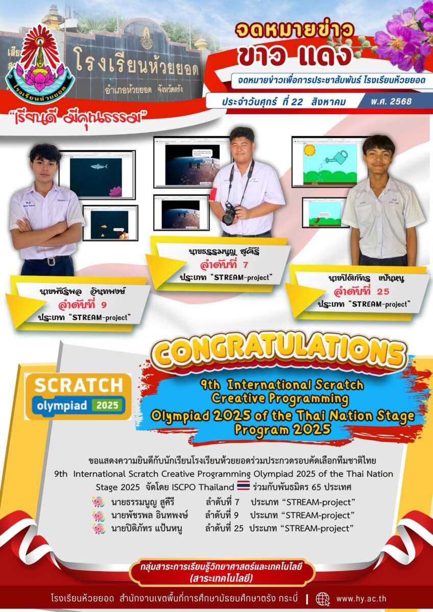 ขอแสดงความยินดีกับนักเรียนโรงเรียนห้วยยอดร่วมประกวดรอบคัดเลือกทีมชาติไทย 9th International Scratch Creative Programming Olympiad 2025 of the Thai Nation Stage 2025 จัดโดย ISCPO Thailand 🇹🇭 ร่วมกับพันธมิตร 65 ประเทศ ได้แก่