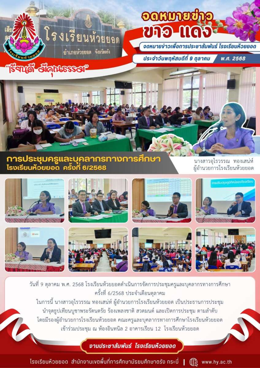 วันที่ 9 ตุลาคม พ.ศ. 2568 โรงเรียนห้วยยอดดำเนินการจัดการประชุมครูและบุคลากรทางการศึกษา ครั้งที่ 6/2568 ประจำเดือนตุลาคม ในการนี้ นางสาวอุไรวรรณ ทองเสน่ห์ ผู้อำนวยการโรงเรียนห้วยยอด เป็นประธานการประชุม นำจุดธูปเทียนบูชาพระรัตนตรัย ร้องเพลงชาติ สวดมนต์ และเปิดการประชุม ตามลำดับ โดยมีรองผู้อำนวยการโรงเรียนห้วยยอด คณะครูและบุคลากรทางการศึกษาโรงเรียนห้วยยอด เข้าร่วมประชุม ณ ห้องอินทนิล 2 อาคารเรียน 12 โรงเรียนห้วยยอด