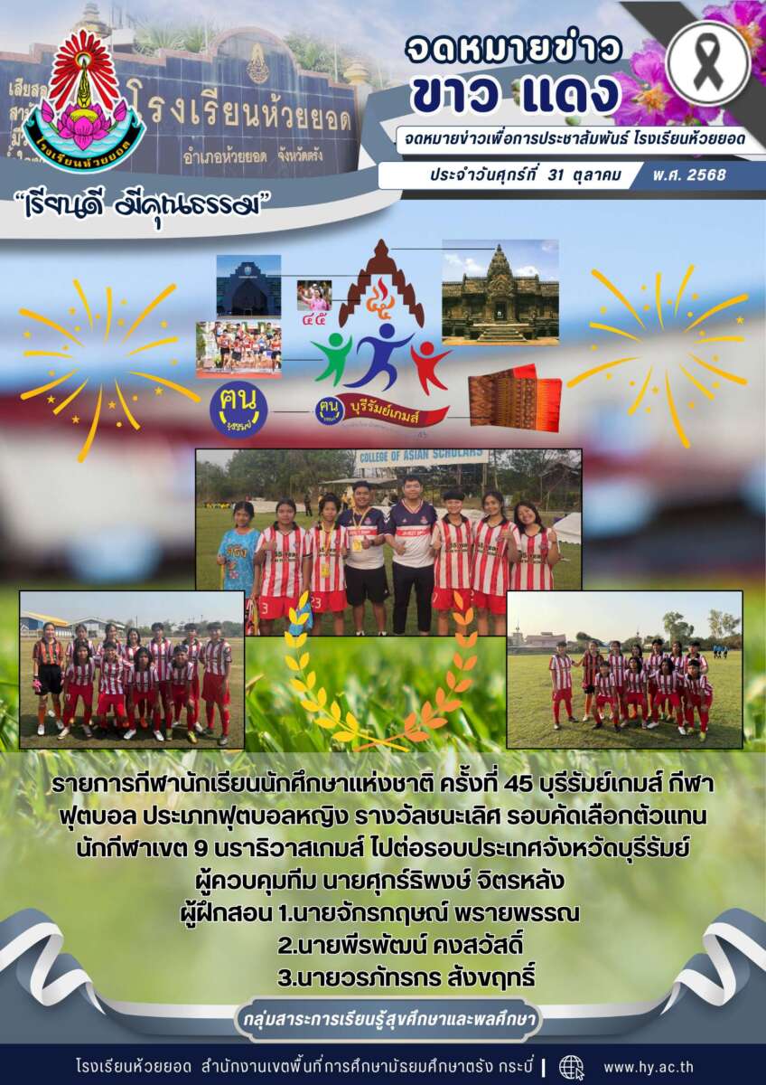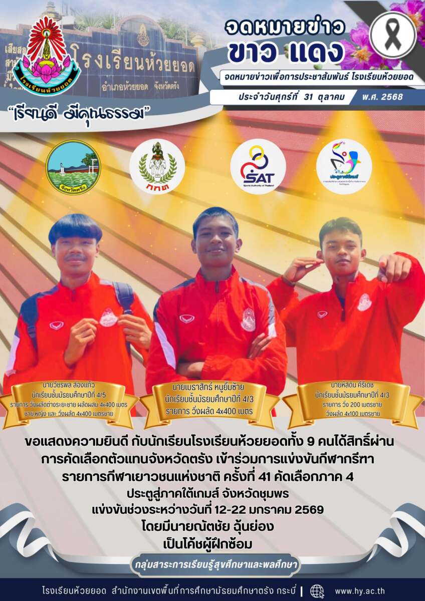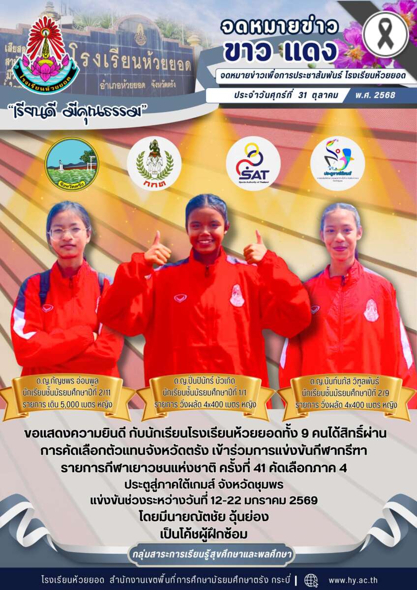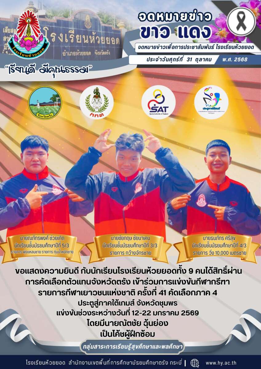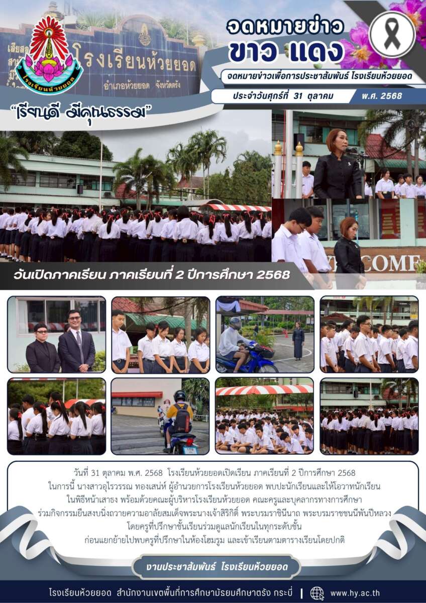 วันที่ 9 ตุลาคม พ.ศ. 2568 โรงเรียนห้วยยอดดำเนินการจัดการประชุมครูและบุคลากรทางการศึกษา ครั้งที่ 6/2568 ประจำเดือนตุลาคม ในการนี้ นางสาวอุไรวรรณ ทองเสน่ห์ ผู้อำนวยการโรงเรียนห้วยยอด เป็นประธานการประชุม นำจุดธูปเทียนบูชาพระรัตนตรัย ร้องเพลงชาติ สวดมนต์ และเปิดการประชุม ตามลำดับ โดยมีรองผู้อำนวยการโรงเรียนห้วยยอด คณะครูและบุคลากรทางการศึกษาโรงเรียนห้วยยอด เข้าร่วมประชุม ณ ห้องอินทนิล 2 อาคารเรียน 12 โรงเรียนห้วยยอด