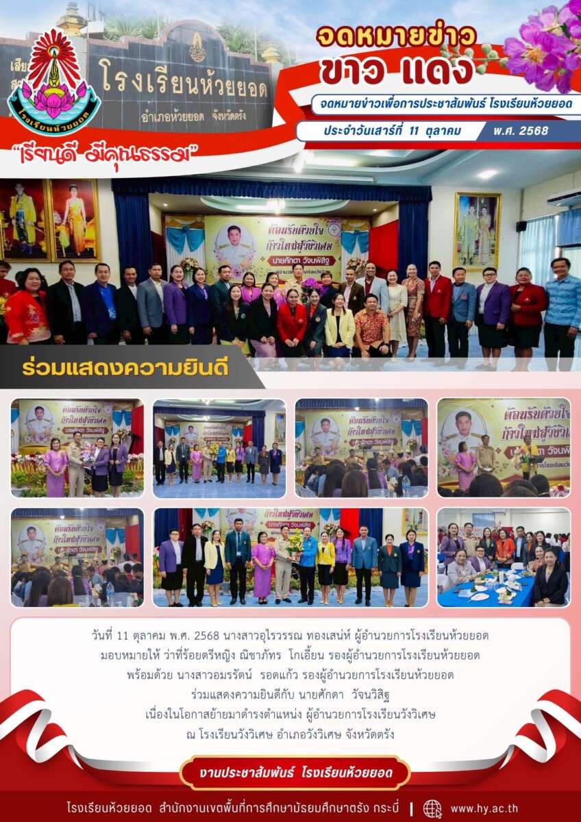 วันที่ 11 ตุลาคม พ.ศ. 2568 นางสาวอุไรวรรณ ทองเสน่ห์ ผู้อำนวยการโรงเรียนห้วยยอด มอบหมายให้ ว่าที่ร้อยตรีหญิง ณิชาภัทร โกเอี้ยน รองผู้อำนวยการโรงเรียนห้วยยอด พร้อมด้วย นางสาวอมรรัตน์ รอดแก้ว รองผู้อำนวยการโรงเรียนห้วยยอดร่วมแสดงความยินดีกับ นายศักดา วัจนวิสิฐ เนื่องในโอกาสย้ายมาดำรงตำแหน่ง ผู้อำนวยการโรงเรียนวังวิเศษ ณ โรงเรียนวังวิเศษ อำเภอวังวิเศษ จังหวัดตรัง