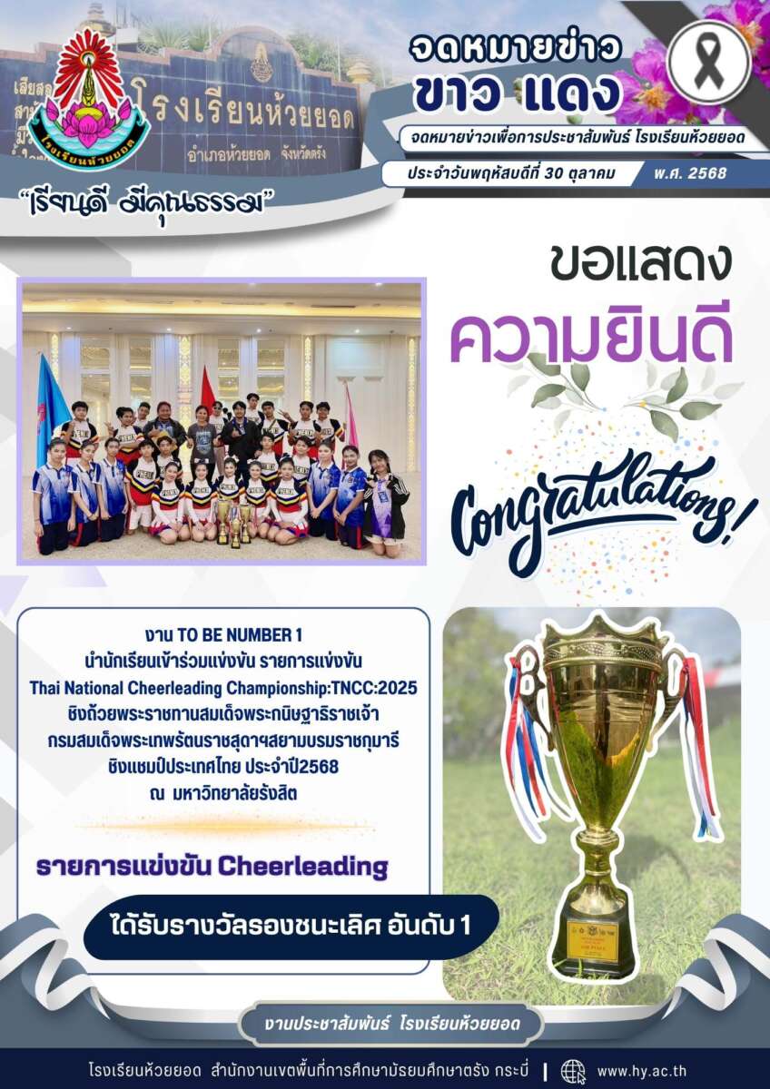 ขอแสดงความยินดีกับนักเรียนกิจกรรม TO BE NUMBER 1 ได้รับรางวัลรองชนะเลิศ อันดับ 1 รายการแข่งขัน Cheerleading ในการแข่งขัน Thai National Cheerleading Championship:TNCC:2025 ชิงถ้วยพระราชทานสมเด็จพระกนิษฐาธิราชเจ้า กรมสมเด็จพระเทพรัตนราชสุดาฯสยามบรมราชกุมารี ชิงเเชมป์ประเทศไทย ประจำปี2568 ณ มหาวิทยาลัยรังสิต