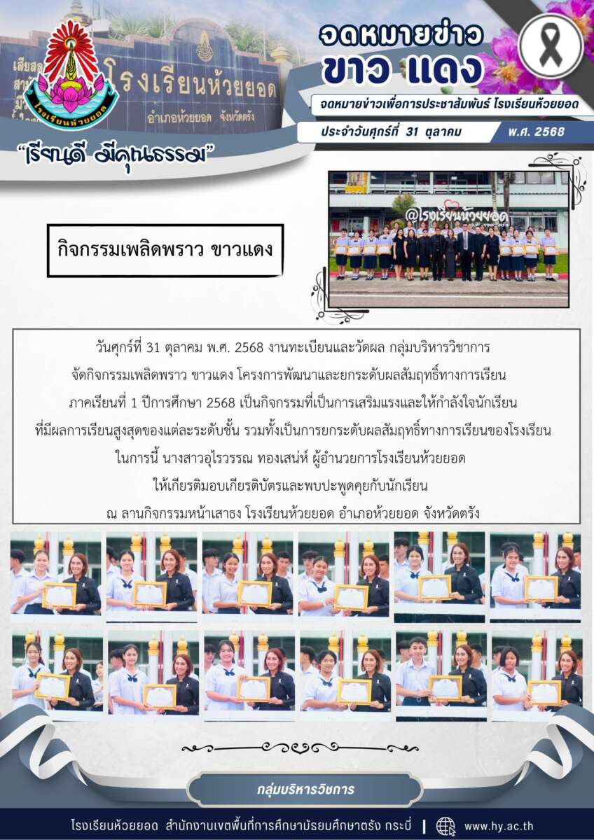วันศุกร์ที่ 31 ตุลาคม พ.ศ. 2568 งานทะเบียนและวัดผล กลุ่มบริหารวิชาการ จัดกิจกรรมเพลิดพราว ขาวแดง โครงการพัฒนาและยกระดับผลสัมฤทธิ์ทางการเรียน ภาคเรียนที่ 1 ปีการศึกษา 2568 เป็นกิจกรรมที่เป็นการเสริมแรงและให้กำลังใจนักเรียน ที่มีผลการเรียนสูงสุดของแต่ละระดับชั้น รวมทั้งเป็นการยกระดับผลสัมฤทธิ์ทางการเรียนของโรงเรียน ในการนี้ นางสาวอุไรวรรณ ทองเสน่ห์ ผู้อำนวยการโรงเรียนห้วยยอด ให้เกียรติมอบเกียรติบัตรและพบปะพูดคุยกับนักเรียน ณ ลานกิจกรรมหน้าเสาธง โรงเรียนห้วยยอด อำเภอห้วยยอด จังหวัดตรัง