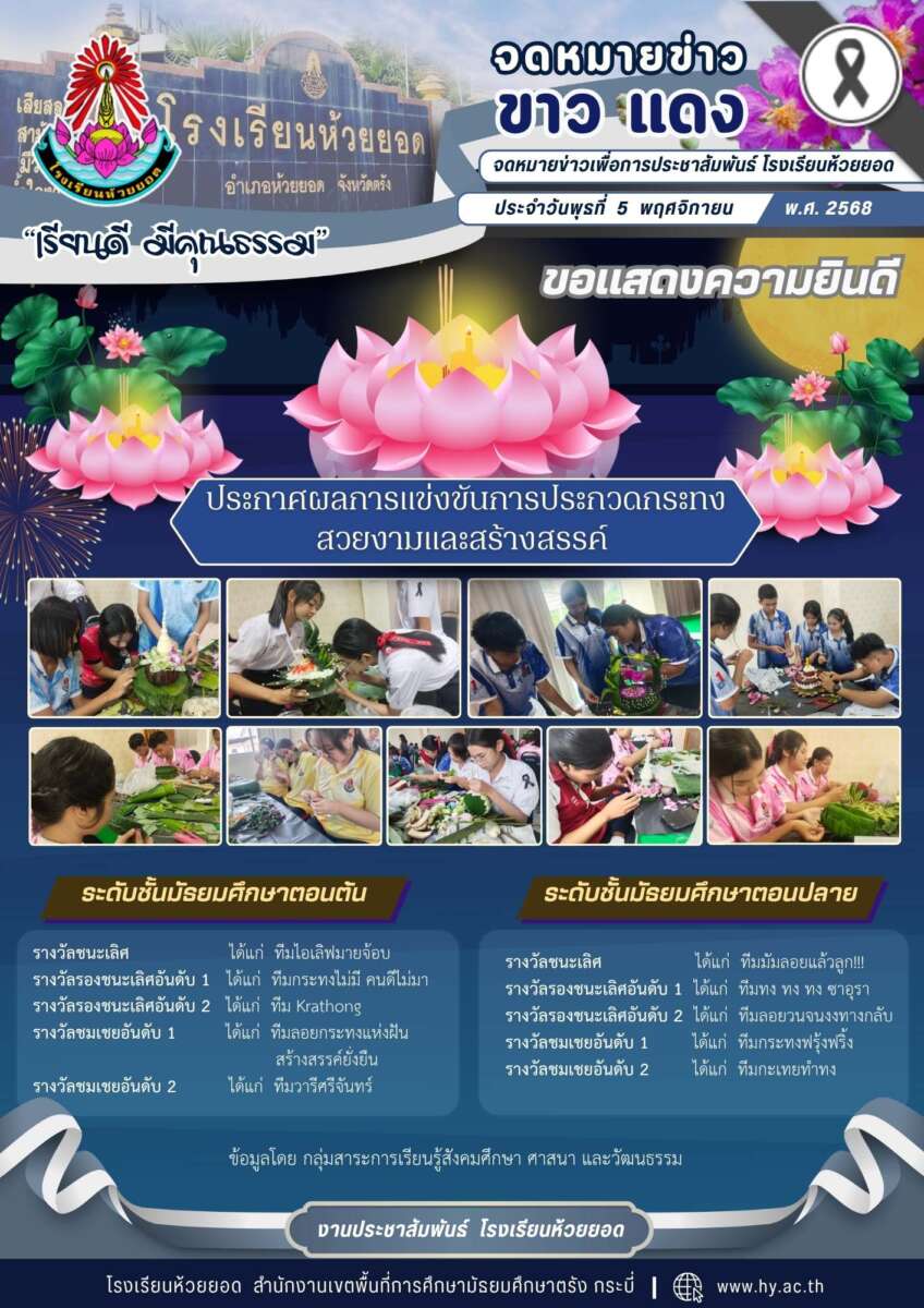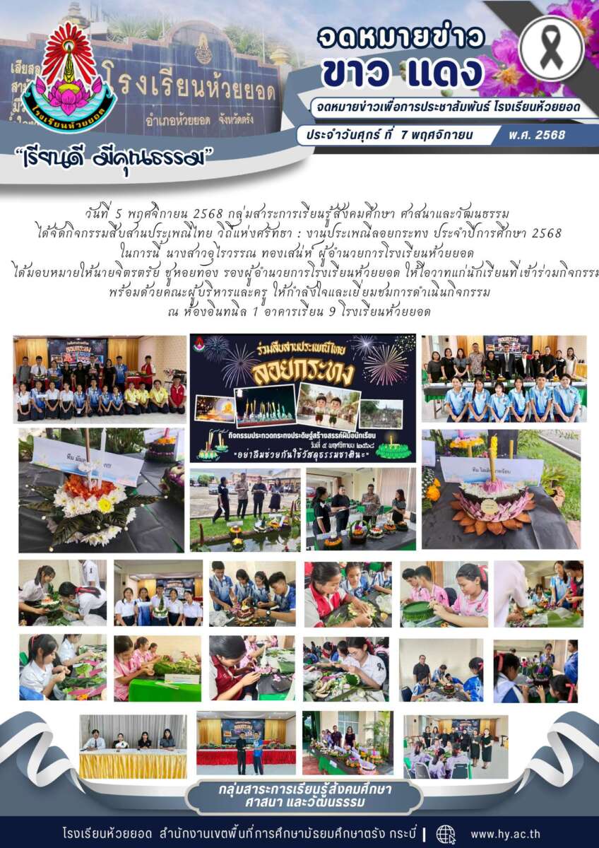 วันที่ 5 พฤศจิกายน 2568 กลุ่มสาระการเรียนรู้สังคมศึกษา ศาสนาและวัฒนธรรม ได้จัดกิจกรรมสืบสานประเพณีไทย วิถีแห่งศรัทธา : งานประเพณีลอยกระทง ประจำปีการศึกษา 2568 ในการนี้ นางสาวอุไรวรรณ ทองเสน่ห์ ผู้อำนวยการโรงเรียนห้วยยอด ได้มอบหมายให้นายจิตรตรัย ชูหอยทอง รองผู้อำนวยการโรงเรียนห้วยยอด ให้โอวาทแก่นักเรียนที่เข้าร่วมกิจกรรม พร้อมด้วยคณะผู้บริหารและครู ให้กำลังใจและเยี่ยมชมการดำเนินกิจกรรม ณ ห้องอินทนิล 1 อาคารเรียน 9 โรงเรียนห้วยยอด