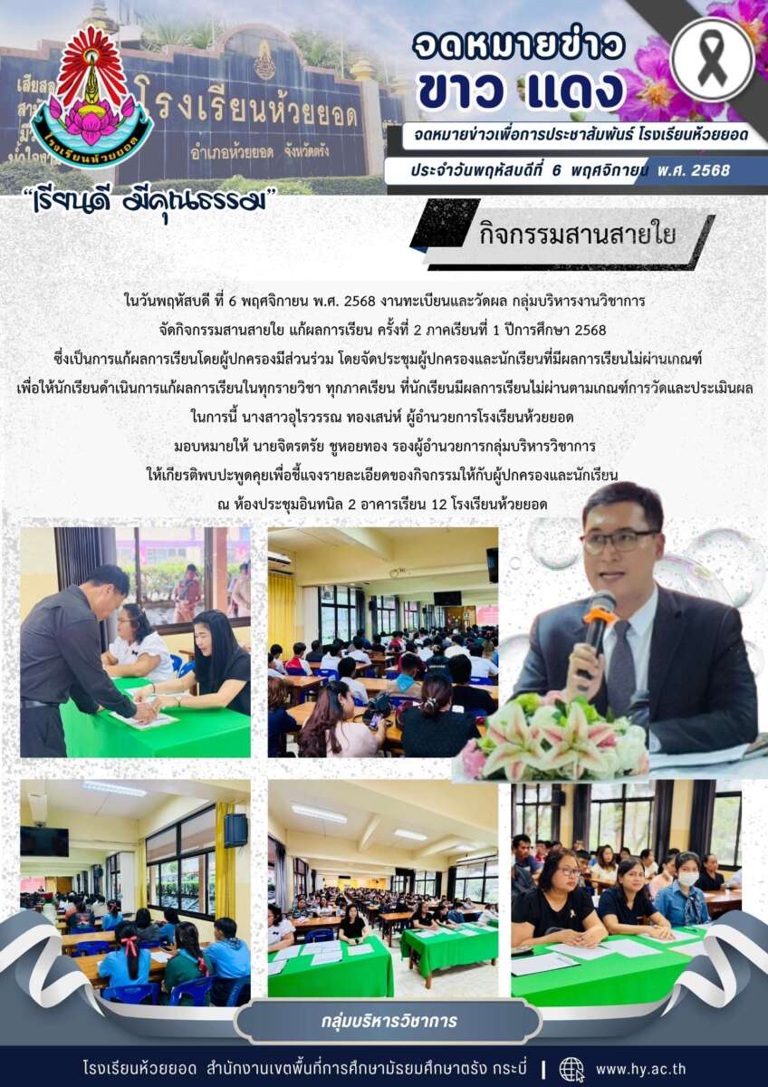 ในวันพฤหัสบดี ที่ 6 พฤศจิกายน พ.ศ. 2568 งานทะเบียนและวัดผล กลุ่มบริหารงานวิชาการ จัดกิจกรรมสานสายใย แก้ผลการเรียน ครั้งที่ 2 ภาคเรียนที่ 1 ปีการศึกษา 2568 ซึ่งเป็นการแก้ผลการเรียนโดยผู้ปกครองมีส่วนร่วม โดยจัดประชุมผู้ปกครองและนักเรียนที่มีผลการเรียนไม่ผ่านเกณฑ์ เพื่อให้นักเรียนดำเนินการแก้ผลการเรียนในทุกรายวิชา ทุกภาคเรียน ที่นักเรียนมีผลการเรียนไม่ผ่านตามเกณฑ์การวัดและประเมินผล ในการนี้ นางสาวอุไรวรรณ ทองเสน่ห์ ผู้อำนวยการโรงเรียนห้วยยอด มอบหมายให้ นายจิตรตรัย ชูหอยทอง รองผู้อำนวยการกลุ่มบริหารวิชาการ ให้เกียรติพบปะพูดคุยเพื่อชี้แจงรายละเอียดของกิจกรรมให้กับผู้ปกครองและนักเรียน ณ ห้องประชุมอินทนิล 2 อาคารเรียน 12 โรงเรียนห้วยยอด
