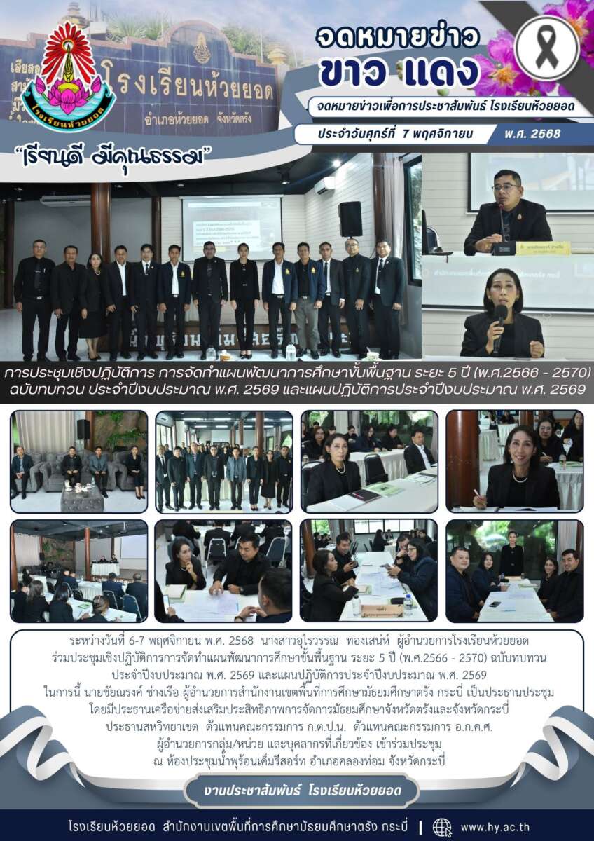 ระหว่างวันที่ 6-7 พฤศจิกายน พ.ศ. 2568 นางสาวอุไรวรรณ ทองเสน่ห์ ผู้อำนวยการโรงเรียนห้วยยอด ร่วมประชุมเชิงปฏิบัติการการจัดทำแผนพัฒนาการศึกษาขั้นพื้นฐาน ระยะ 5 ปี (พ.ศ.2566 – 2570) ฉบับทบทวนประจำปีงบประมาณ พ.ศ. 2569 และแผนปฏิบัติการประจำปีงบประมาณ พ.ศ. 2569 ในการนี้ นายชัยณรงค์ ช่างเรือ ผู้อำนวยการสำนักงานเขตพื้นที่การศึกษามัธยมศึกษาตรัง กระบี่ เป็นประธานประชุม โดยมีประธานเครือข่ายส่งเสริมประสิทธิภาพการจัดการมัธยมศึกษาจังหวัดตรังและจังหวัดกระบี่ ประธานสหวิทยาเขต ตัวแทนคณะกรรมการ ก.ต.ป.น. ตัวแทนคณะกรรมการ อ.ก.ค.ศ. ผู้อำนวยการกลุ่ม/หน่วย และบุคลากรที่เกี่ยวข้อง เข้าร่วมประชุม ณ ห้องประชุมน้ำพุร้อนเค็มรีสอร์ท อำเภอคลองท่อม จังหวัดกระบี่