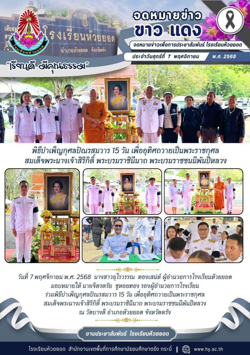 วันที่ 7 พฤศจิกายน พ.ศ. 2568 นางสาวอุไรวรรณ ทองเสน่ห์ ผู้อำนวยการโรงเรียนห้วยยอด มอบหมายให้ นายจิตรตรัย ชูหอยทอง รองผู้อำนวยการโรงเรียน ร่วมพิธีบำเพ็ญกุศลปัณรสมวาร 15 วัน เพื่ออุทิศถวายเป็นพระราชกุศล สมเด็จพระนางเจ้าสิริกิติ์ พระบรมราชินีนาถ พระบรมราชชนนีพันปีหลวง ณ วัดบางดี อำเภอห้วยยอด จังหวัดตรัง