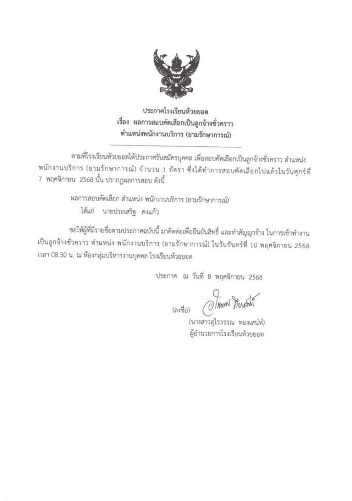 ตามที่โรงเรียนห้วยยอดได้ประกาศรับสมัครบุคคล เพื่อสอบคัดเลือกเป็นลูกจ้างชั่วคราว ตำแหน่งพนักงานบริการ (ยามรักษาการณ์) จำนวน 1 อัตรา ซึ่งได้ทำการสอบคัดเลือกไปแล้วในวันศุกร์ที่ 7 พฤศจิกายน 2568 นั้น ปรากฏผลการสอบประกาศ