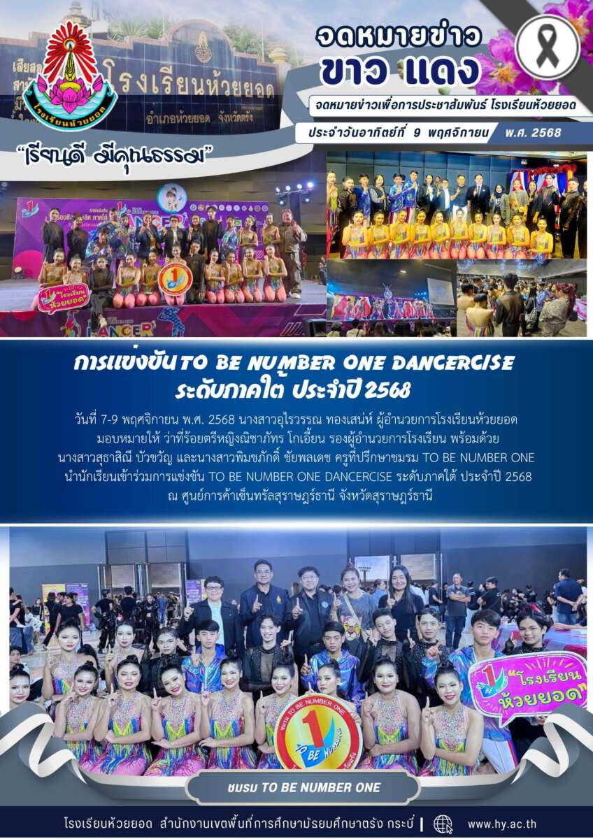 วันที่ 7-9 พฤศจิกายน พ.ศ. 2568 นางสาวอุไรวรรณ ทองเสน่ห์ ผู้อำนวยการโรงเรียนห้วยยอด มอบหมายให้ ว่าที่ร้อยตรีหญิงณิชาภัทร โกเอี้ยน รองผู้อำนวยการโรงเรียน พร้อมด้วย นางสาวสุธาสิณี บัวขวัญ และนางสาวพิมชภักดิ์ ชัยพลเดช ครูที่ปรึกษาชมรม TO BE NUMBER ONE นำนักเรียนเข้าร่วมการแข่งขัน TO BE NUMBER ONE DANCERCISE ระดับภาคใต้ ประจำปี 2568 ณ ศูนย์การค้าเซ็นทรัลสุราษฎร์ธานี จังหวัดสุราษฎร์ธานี
