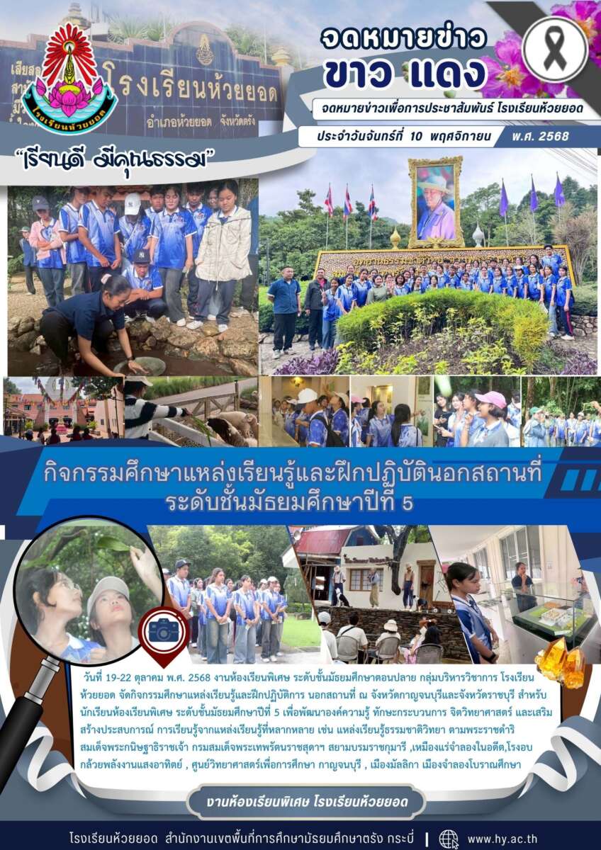 วันที่ 19-22 ตุลาคม พ.ศ. 2568 งานห้องเรียนพิเศษ ระดับชั้นมัธยมศึกษาตอนปลาย กลุ่มบริหารวิชาการ โรงเรียนห้วยยอด จัดกิจกรรมศึกษาแหล่งเรียนรู้และฝึกปฏิบัติการ นอกสถานที่ ณ จังหวัดกาญจนบุรีและจังหวัดราชบุรี สำหรับนักเรียนห้องเรียนพิเศษ ระดับชั้นมัธยมศึกษาปีที่ 5 เพื่อพัฒนาองค์ความรู้ ทักษะกระบวนการ จิตวิทยาศาสตร์ และเสริมสร้างประสบการณ์ การเรียนรู้จากแหล่งเรียนรู้ที่หลากหลาย เช่น แหล่งเรียนรู้ธรรมชาติวิทยา ตามพระราชดำริ สมเด็จพระกนิษฐาธิราชเจ้า กรมสมเด็จพระเทพรัตนราชสุดาฯ สยามบรมราชกุมารี ,เหมืองแร่จำลองในอดีต,โรงอบกล้วยพลังงานแสงอาทิตย์ , ศูนย์วิทยาศาสตร์เพื่อการศึกษา กาญจนบุรี , เมืองมัลลิกา เมืองจำลองโบราณศึกษา