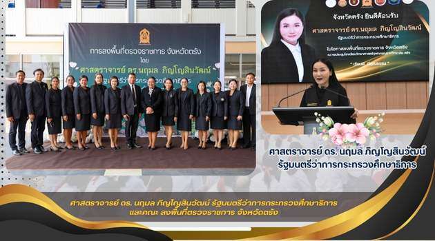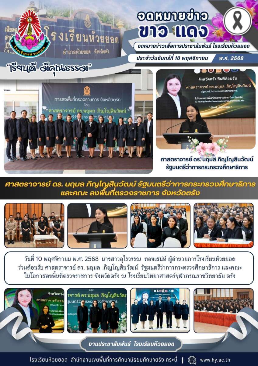 วันที่ 10 พฤศจิกายน พ.ศ. 2568 นางสาวอุไรวรรณ ทองเสน่ห์ ผู้อำนวยการโรงเรียนห้วยยอด ร่วมต้อนรับ ศาสตราจารย์ ดร. นฤมล ภิญโญสินวัฒน์ รัฐมนตรีว่าการกระทรวงศึกษาธิการ และคณะ ในโอกาสลงพื้นที่ตรวจราชการ จังหวัดตรัง ณ โรงเรียนวิทยาศาสตร์จุฬาภรณราชวิทยาลัย ตรัง