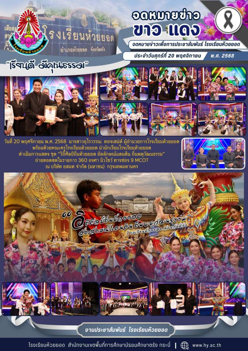 วันที่ 20 พฤศจิกายน พ.ศ. 2568 นางสาวอุไรวรรณ ทองเสน่ห์ ผู้อำนวยการโรงเรียนห้วยยอด พร้อมด้วยคณะครูโรงเรียนห้วยยอด นำนักเรียนโรงเรียนห้วยยอด ดำเนินการแสดง ชุด “วิถีศิลป์ถิ่นห้วยยอด อัตลักษณ์แดนดิน ถิ่นพหุวัฒนธรรม” ถ่ายทอดสดในรายการ 360 องศา นิวโชว์ ทางช่อง 9 MCOT ณ บริษัท อสมท จำกัด (มหาชน) กรุงเทพมหานคร
