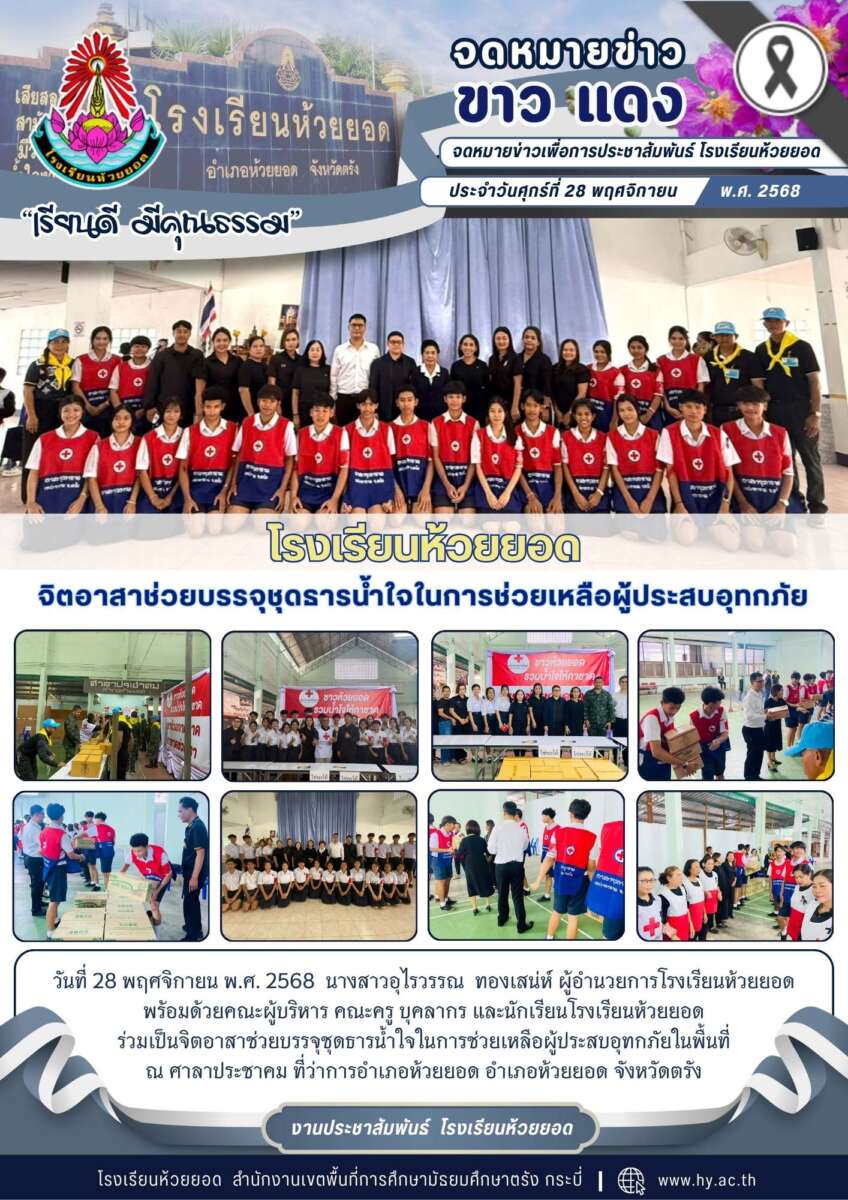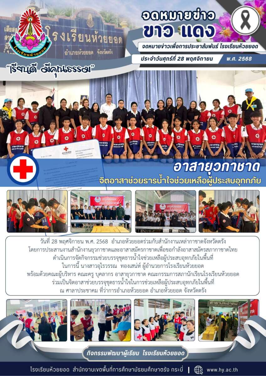วันที่ 28 พฤศจิกายน พ.ศ. 2568 อำเภอห้วยยอดร่วมกับสำนักงานเหล่ากาชาดจังหวัดตรังโดยการประสานงานสำนักงานยุวกาชาดและอาสาสมัครกาชาดเพื่อขอกำลังอาสาสมัครสภากาชาดไทยดำเนินการจัดกิจกรรมช่วยบรรจุชุดธารน้ำใจช่วยเหลือผู้ประสบอุทกภัยในพื้นที่ ในการนี้ นางสาวอุไรวรรณ ทองเสน่ห์ ผู้อำนวยการโรงเรียนห้วยยอดพร้อมด้วยคณะผู้บริหาร คณะครู บุคลากร อาสายุวกาชาด คณะกรรมการสภานักเรียนโรงเรียนห้วยยอด ร่วมเป็นจิตอาสาช่วยบรรจุชุดธารน้ำใจในการช่วยเหลือผู้ประสบอุทกภัยในพื้นที่ ณ ศาลาประชาคม ที่ว่าการอำเภอห้วยยอด อำเภอห้วยยอด จังหวัดตรัง