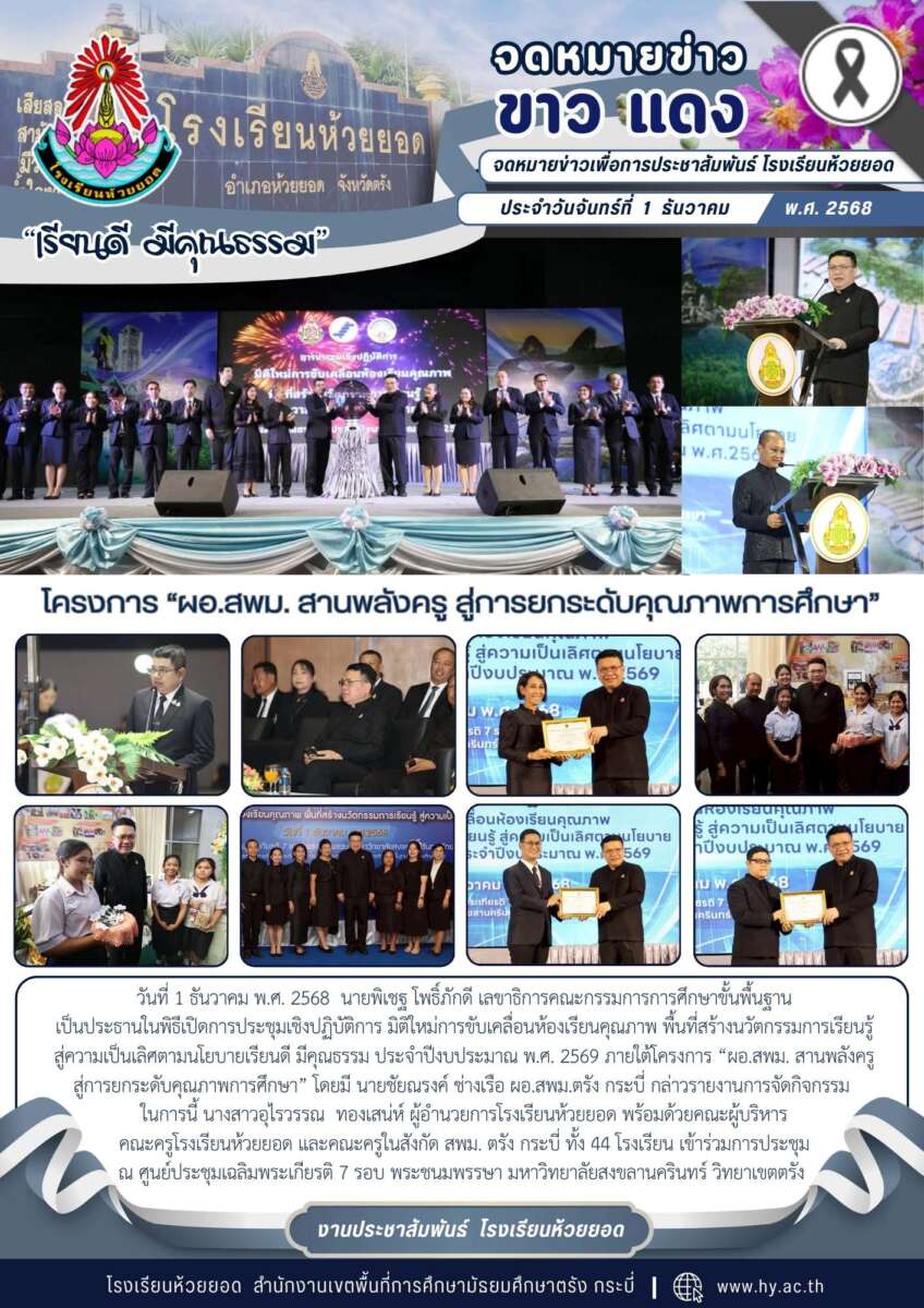 วันที่ 1 ธันวาคม พ.ศ. 2568 นายพิเชฐ โพธิ์ภักดี เลขาธิการคณะกรรมการการศึกษาขั้นพื้นฐานเป็นประธานในพิธีเปิดการประชุมเชิงปฏิบัติการ มิติใหม่การขับเคลื่อนห้องเรียนคุณภาพ พื้นที่สร้างนวัตกรรมการเรียนรู้สู่ความเป็นเลิศตามนโยบายเรียนดี มีคุณธรรม ประจำปีงบประมาณ พ.ศ. 2569 ภายใต้โครงการ “ผอ.สพม. สานพลังครูสู่การยกระดับคุณภาพการศึกษา” โดยมี นายชัยณรงค์ ช่างเรือ ผอ.สพม.ตรัง กระบี่ กล่าวรายงานการจัดกิจกรรม ในการนี้ นางสาวอุไรวรรณ ทองเสน่ห์ ผู้อำนวยการโรงเรียนห้วยยอด พร้อมด้วยคณะผู้บริหารคณะครูโรงเรียนห้วยยอด และคณะครูในสังกัด สพม. ตรัง กระบี่ ทั้ง 44 โรงเรียน เข้าร่วมการประชุม ณ ศูนย์ประชุมเฉลิมพระเกียรติ 7 รอบ พระชนมพรรษา มหาวิทยาลัยสงขลานครินทร์ วิทยาเขตตรัง