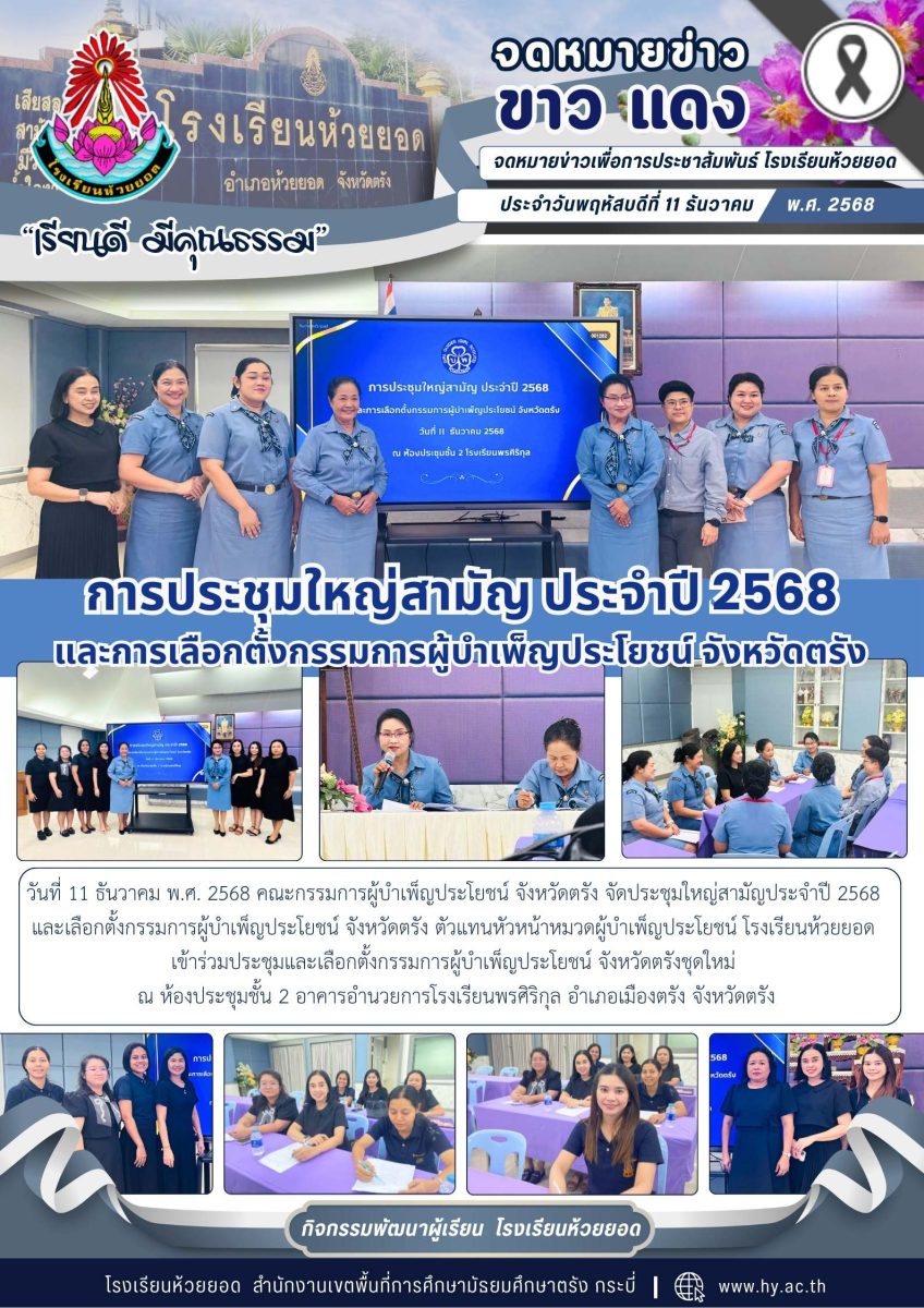 วันที่ 11 ธันวาคม พ.ศ. 2568 คณะกรรมการผู้บำเพ็ญประโยชน์ จังหวัดตรัง จัดประชุมใหญ่สามัญประจำปี 2568 และเลือกตั้งกรรมการผู้บำเพ็ญประโยชน์ จังหวัดตรัง ตัวแทนหัวหน้าหมวดผู้บำเพ็ญประโยชน์ โรงเรียนห้วยยอด เข้าร่วมประชุมและเลือกตั้งกรรมการผู้บำเพ็ญประโยชน์ จังหวัดตรังชุดใหม่ ณ ห้องประชุมชั้น 2 อาคารอำนวยการโรงเรียนพรศิริกุล อำเภอเมืองตรัง จังหวัดตรัง