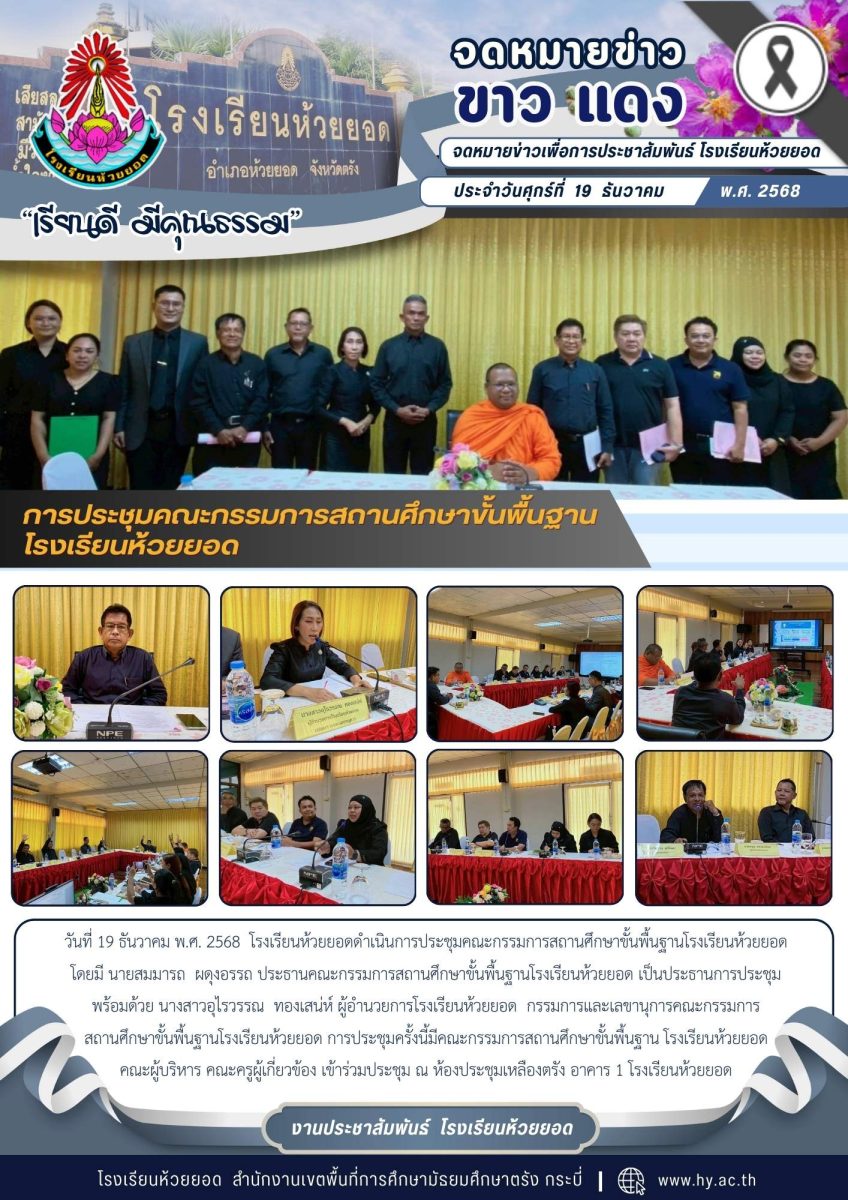วันที่ 19 ธันวาคม พ.ศ. 2568 โรงเรียนห้วยยอดดำเนินการประชุมคณะกรรมการสถานศึกษาขั้นพื้นฐานโรงเรียนห้วยยอด โดยมี นายสมมารถ ผดุงอรรถ ประธานคณะกรรมการสถานศึกษาขั้นพื้นฐานโรงเรียนห้วยยอด เป็นประธานการประชุม พร้อมด้วย นางสาวอุไรวรรณ ทองเสน่ห์ ผู้อำนวยการโรงเรียนห้วยยอด กรรมการและเลขานุการคณะกรรมการสถานศึกษาขั้นพื้นฐานโรงเรียนห้วยยอด การประชุมครั้งนี้มีคณะกรรมการสถานศึกษาขั้นพื้นฐาน โรงเรียนห้วยยอด คณะผู้บริหาร คณะครูผู้เกี่ยวข้อง เข้าร่วมประชุม ณ ห้องประชุมเหลืองตรัง อาคาร 1 โรงเรียนห้วยยอด